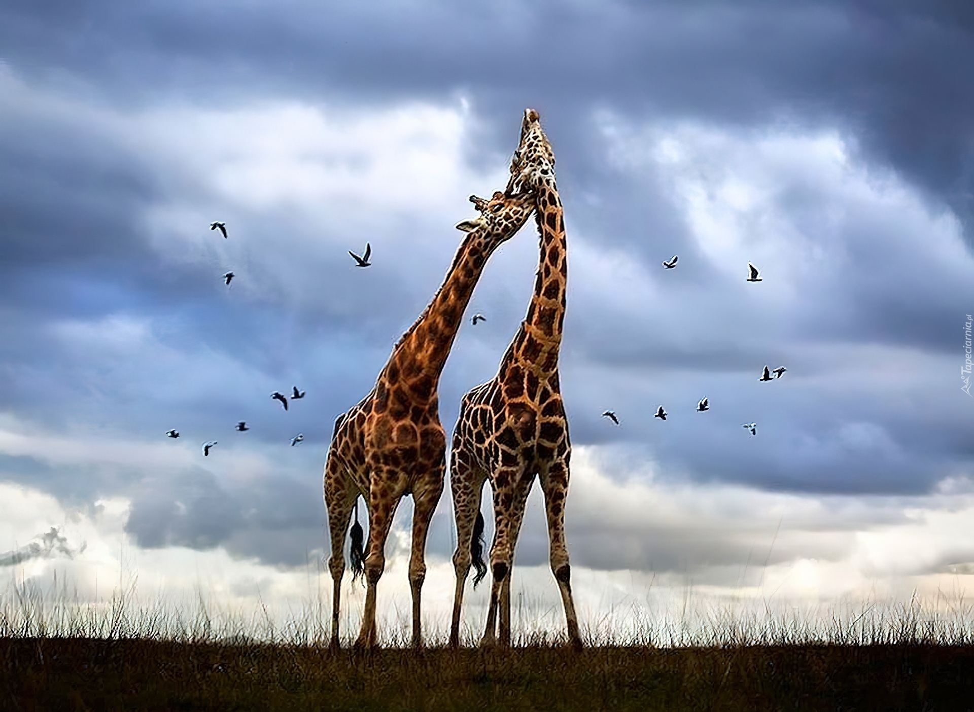 Edytor tapety: Żyrafy, Ptaki, Chmury, Trawy