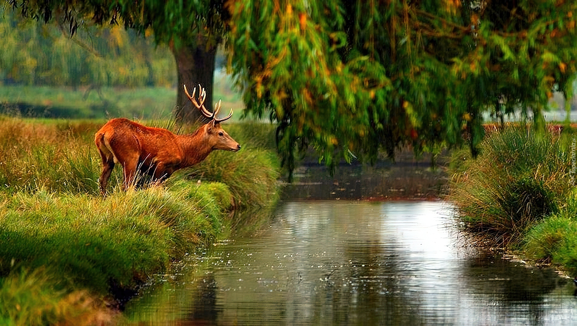 Edytor tapety: Jeleń, Rzeka, Las, Łąka