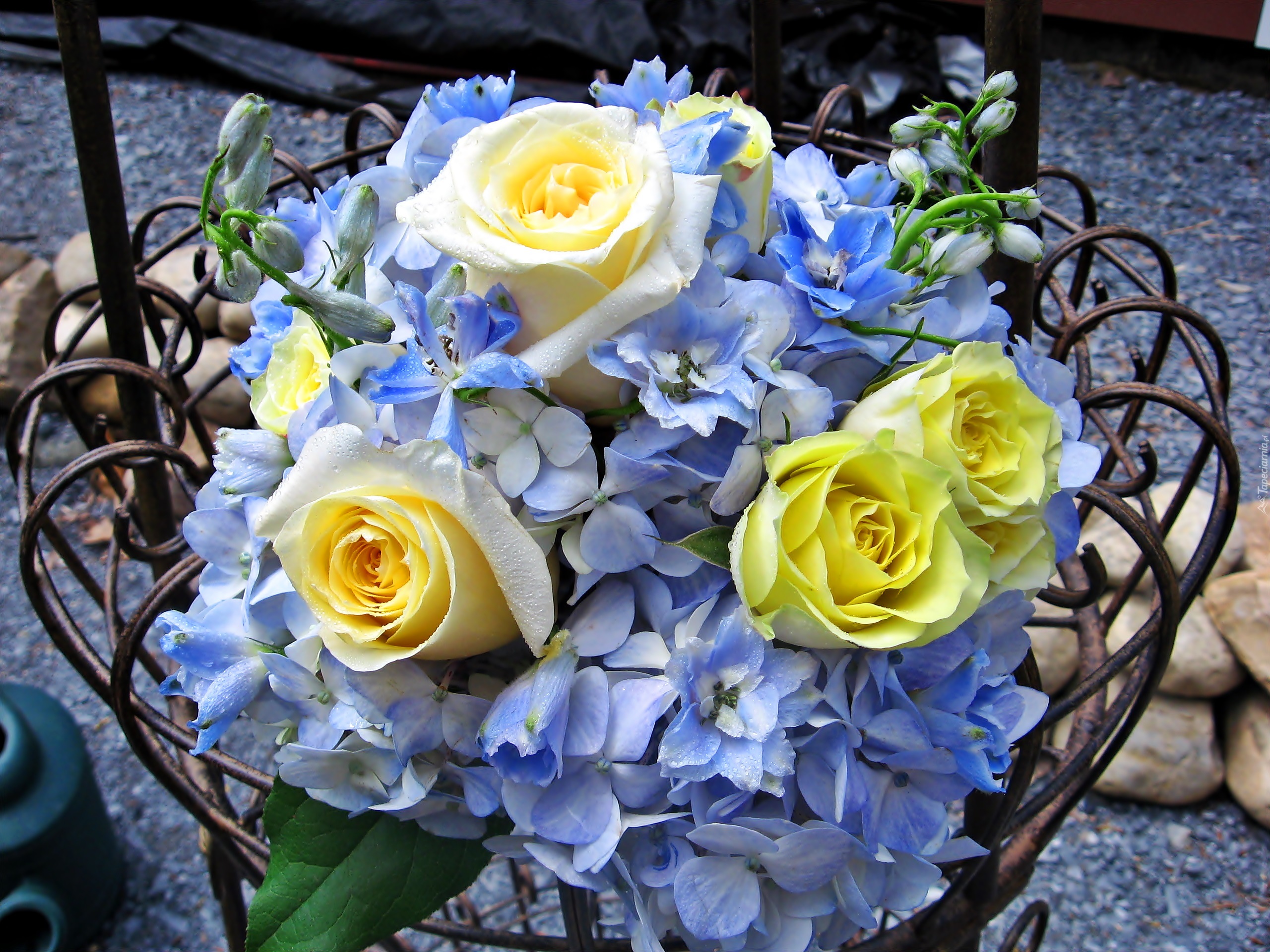Edytor tapety: Bukiet, Żółtych, Róż, Niebieskie, Kwiatuszki