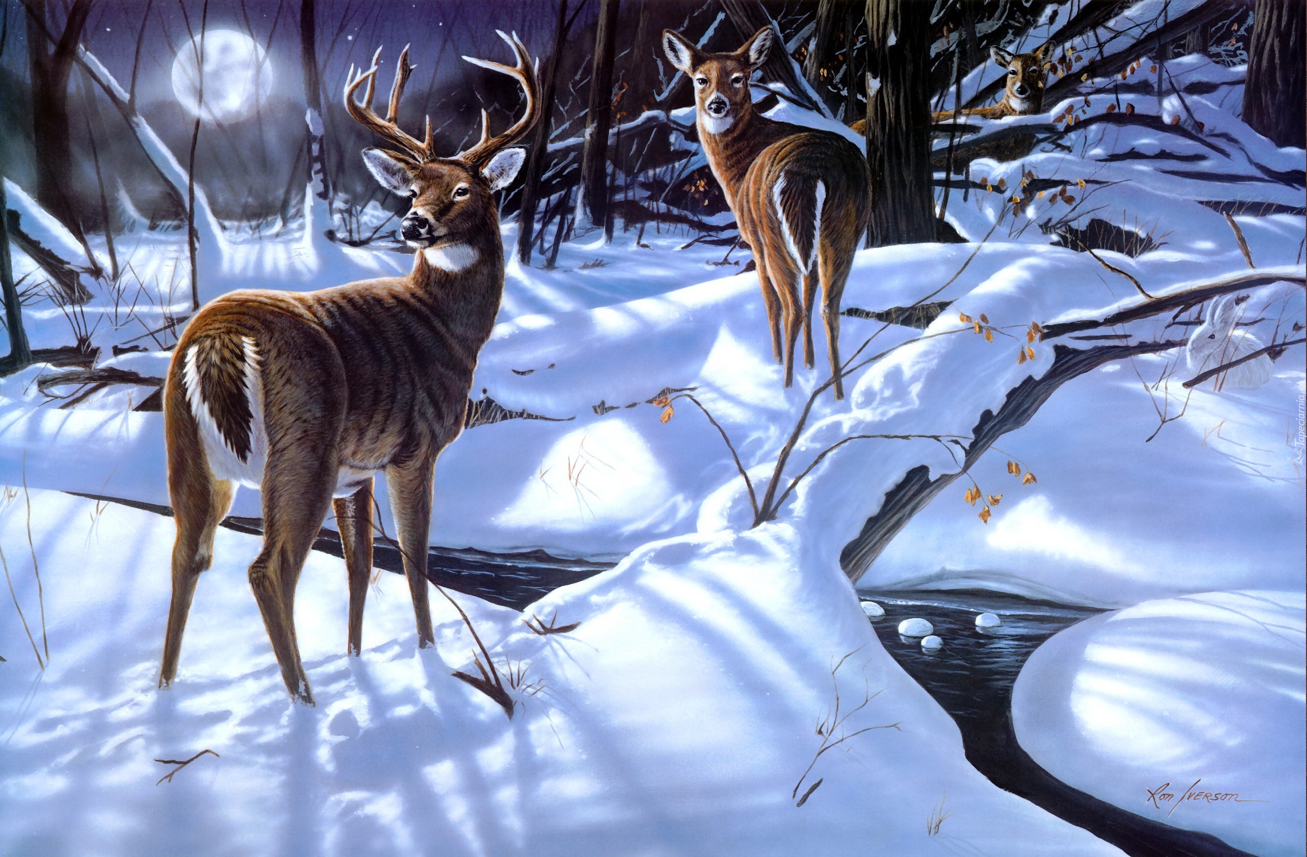 Edytor tapety: Jeleń, Łania, Las, Zima