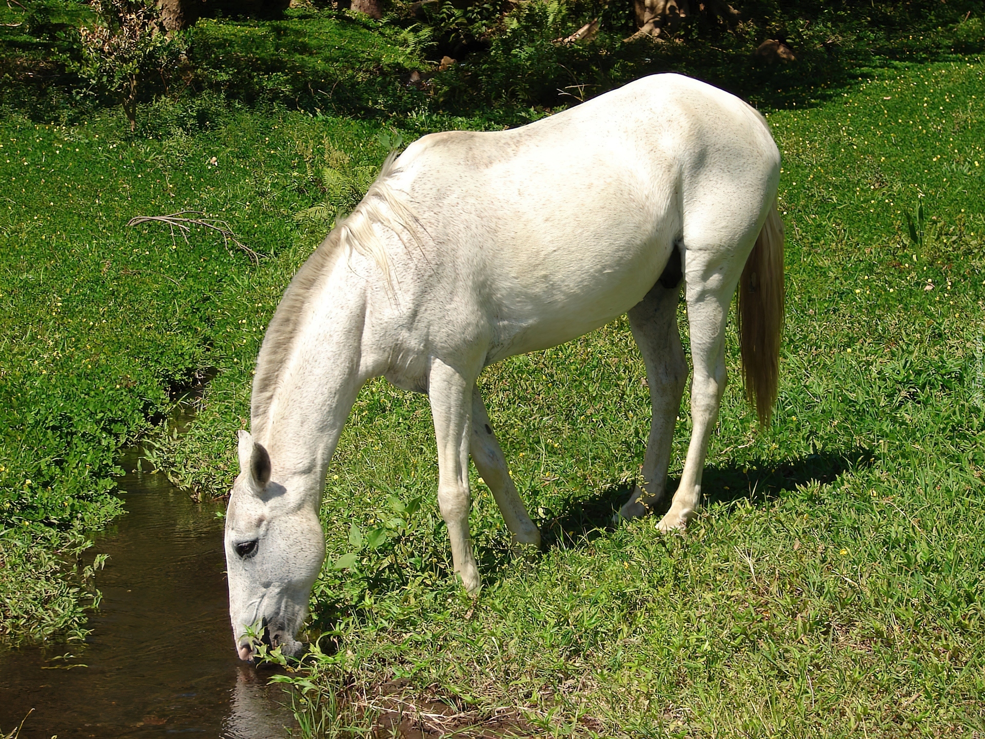 Edytor tapety: Koń, Łąka, Strumyk, Pragnienie