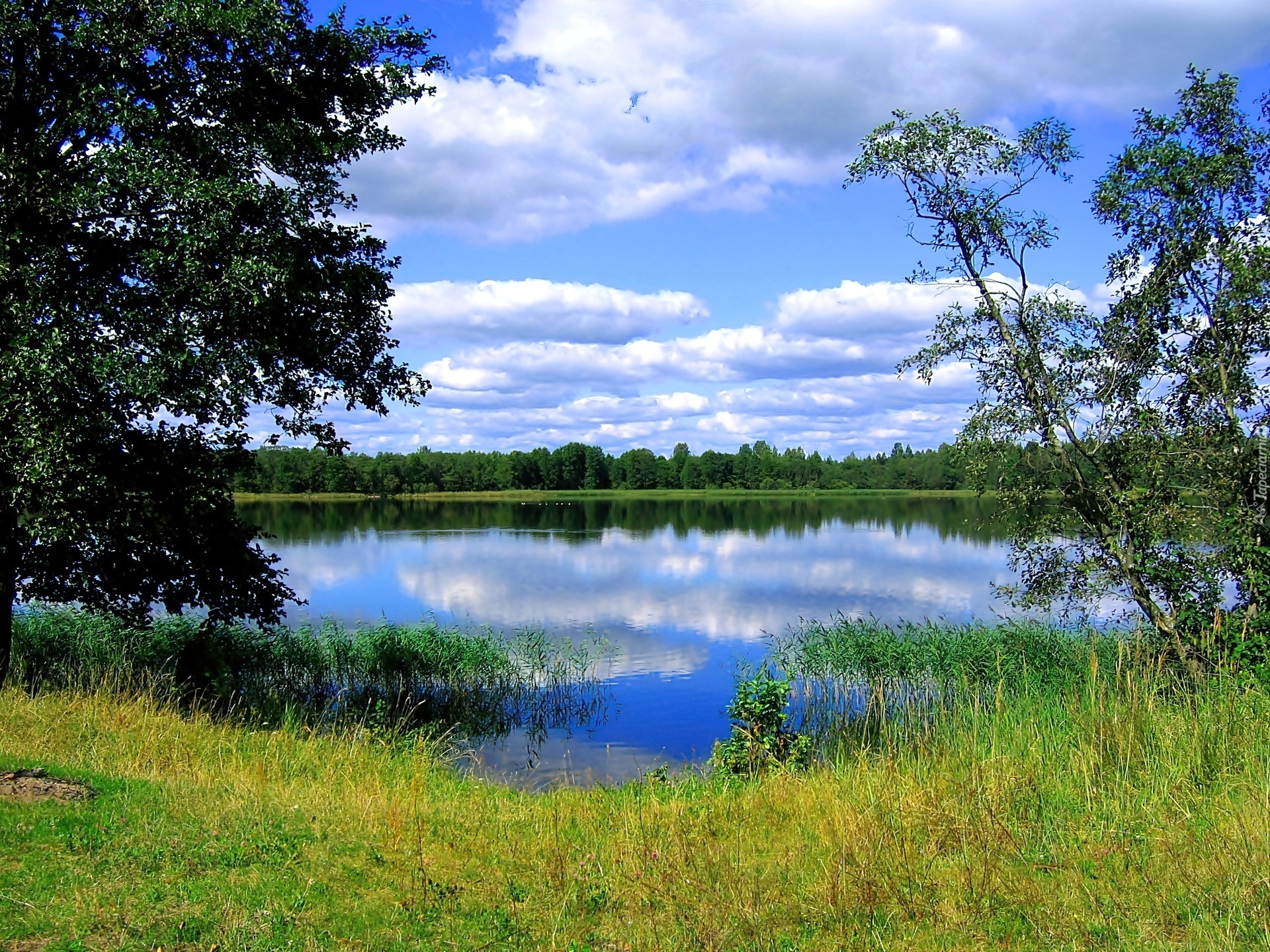 Edytor tapety: Jezioro, Drzewa, Las, Chmury, Odbicie