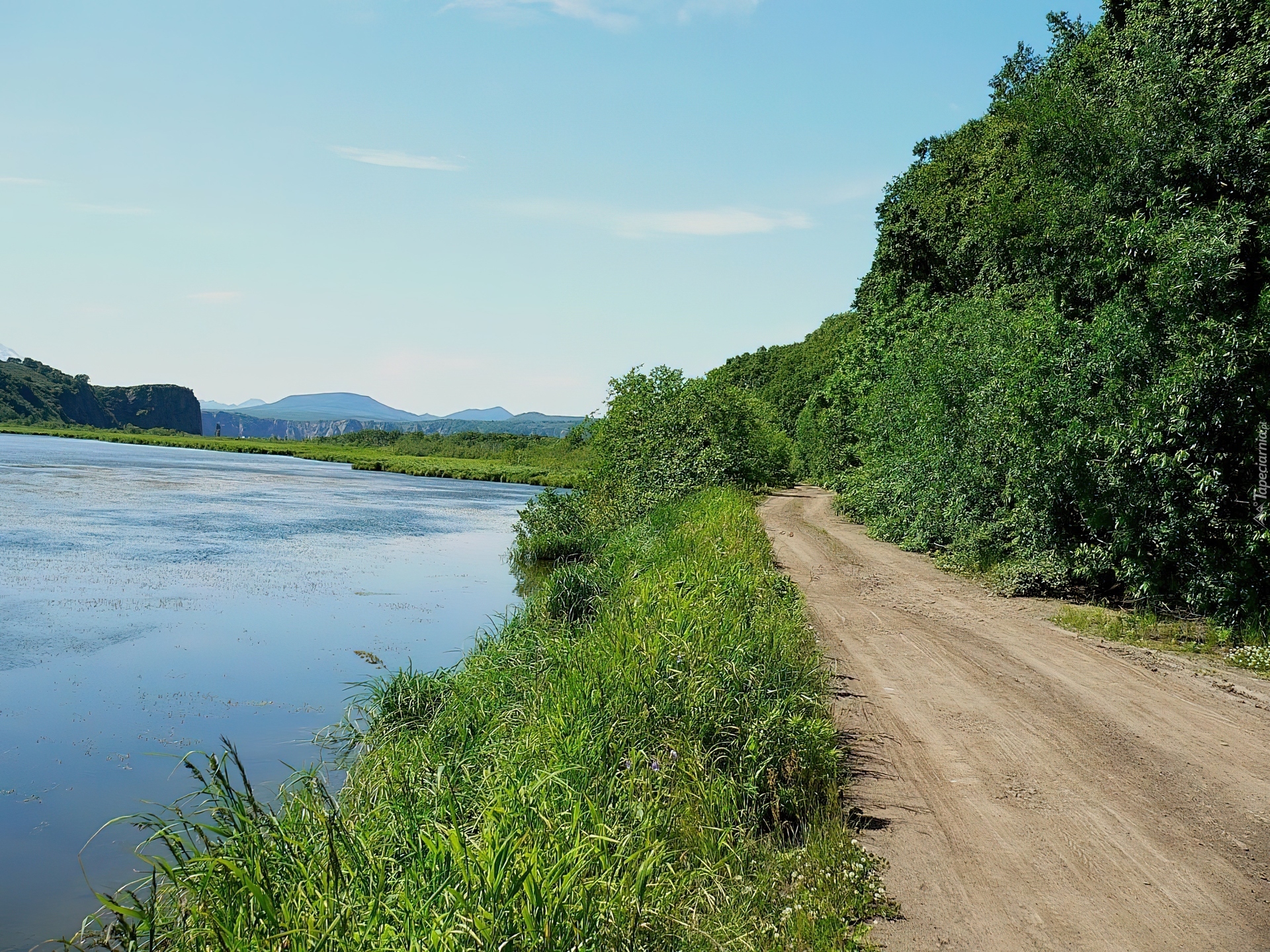 Edytor tapety: Jezioro, Droga, Drzewa, Zieleń
