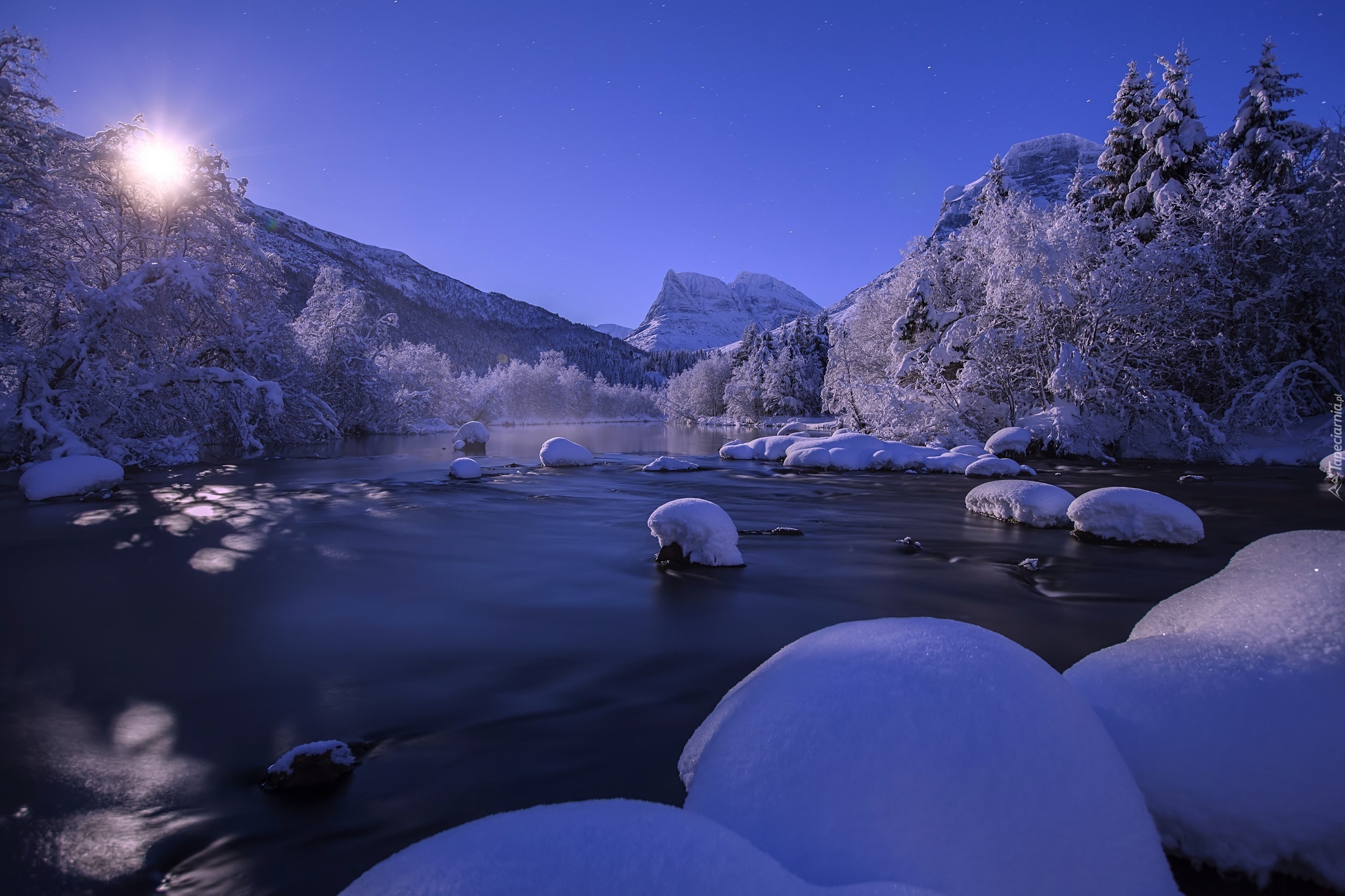 Edytor tapety: Góry, Wschód, Słońca, Rzeka, Kamienie, Drzewa