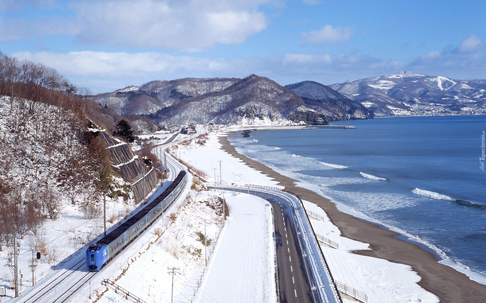 Edytor tapety: Rzeka, Góry, Droga, Pociąg, Zima