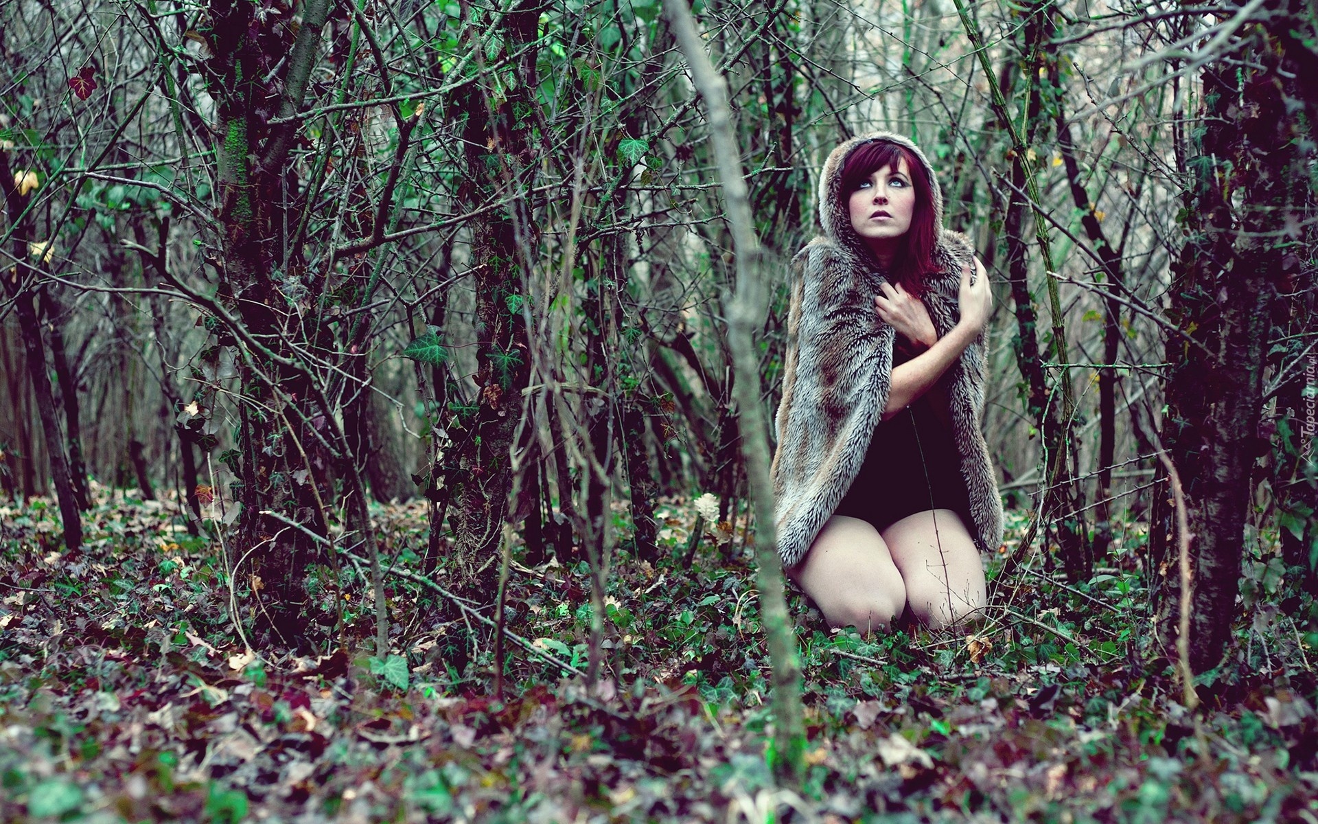 Edytor tapety: Przerażona, Kobieta, Futro, Las