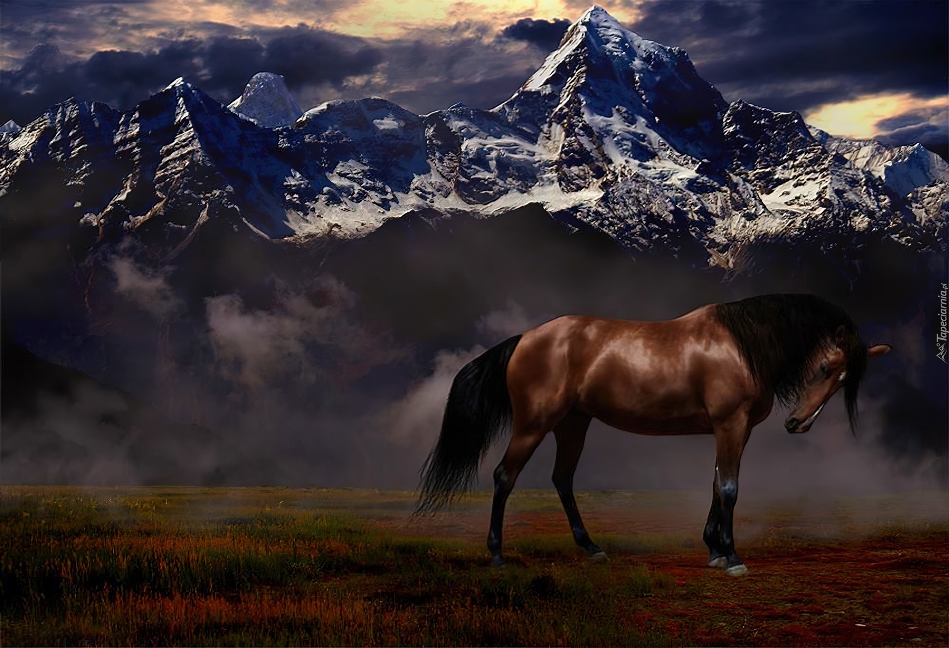 Edytor tapety: Koń, Góry, Łąka