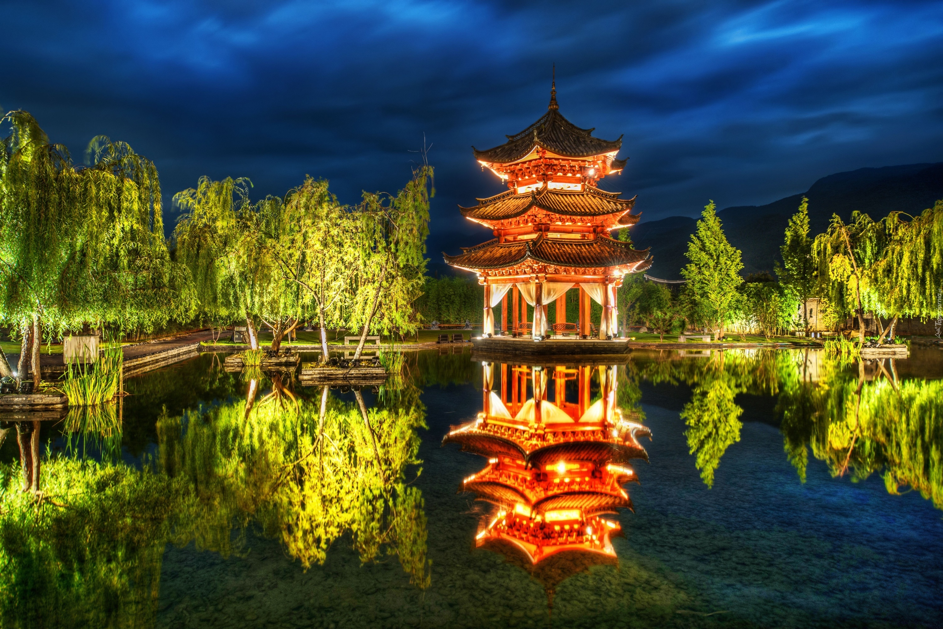Edytor tapety: Dom, Drzewa, Jezioro, Odbicie, Chiny