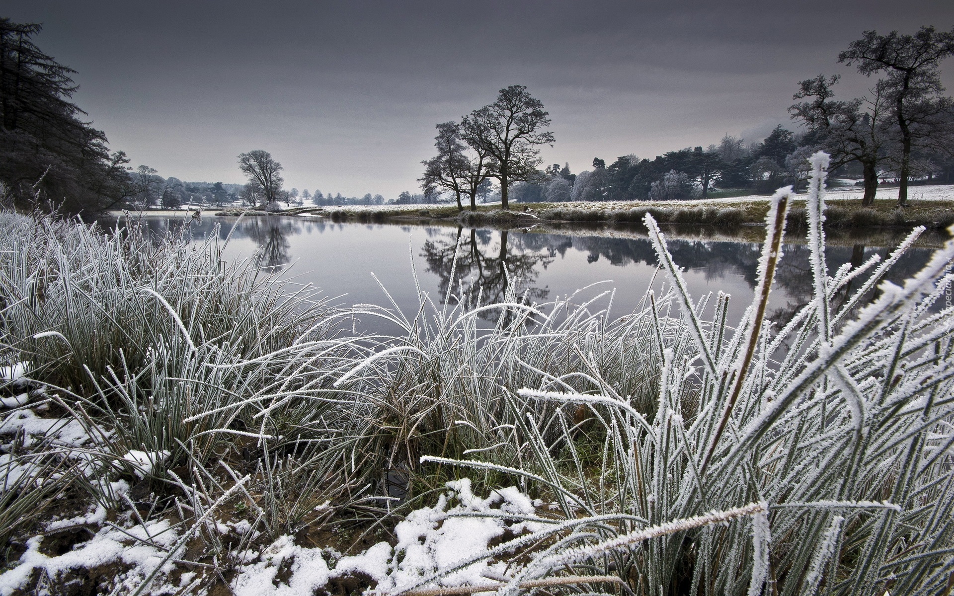 Edytor tapety: Rzeka, Drzewa, Trawy, Zima