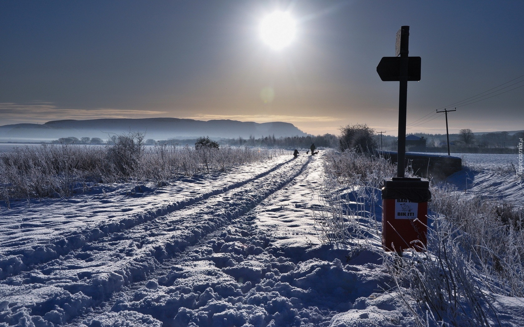Edytor tapety: Droga, Śnieg, Krzewy, Słońce