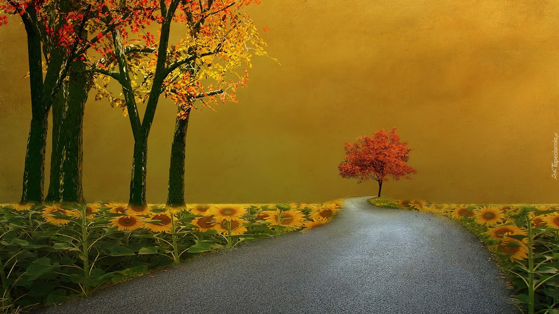 Edytor tapety: Grafika, Droga, Drzewa, Słoneczniki