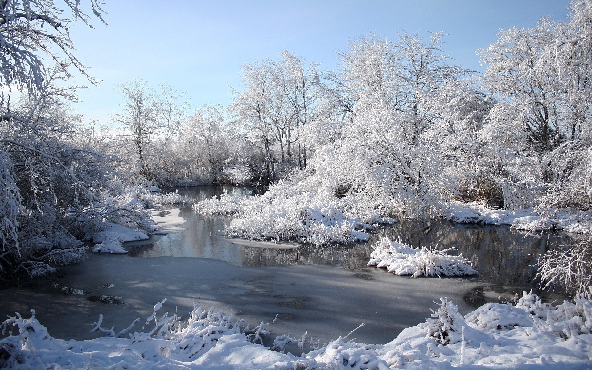 Edytor tapety: Rzeka, Ośnieżone, Drzewa, Zima