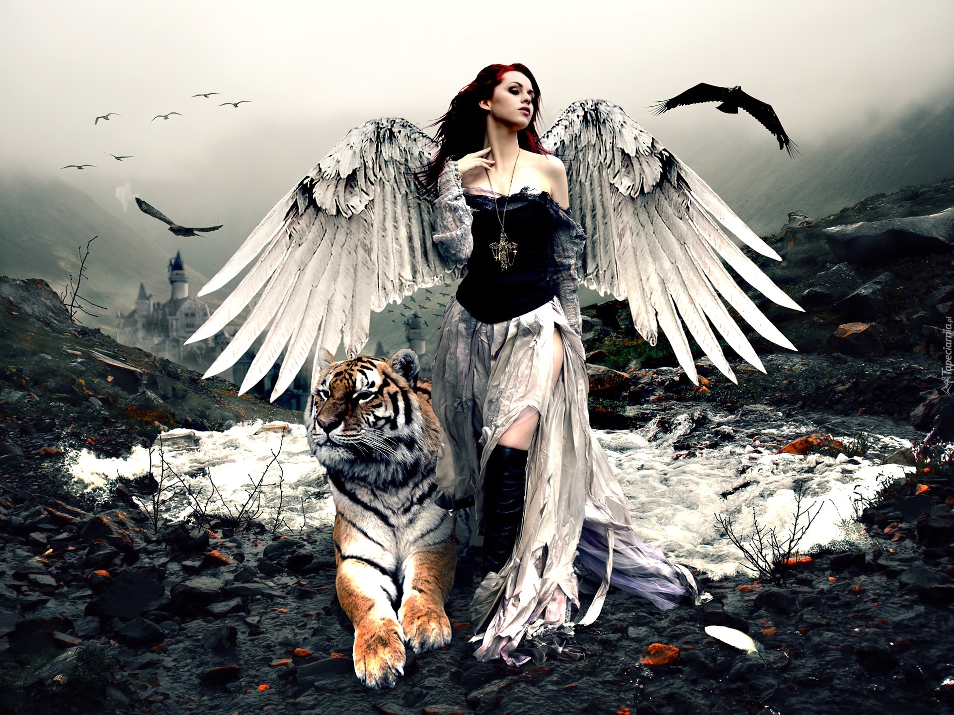 Edytor tapety: Kobieta, Skrzydła, Tygrys