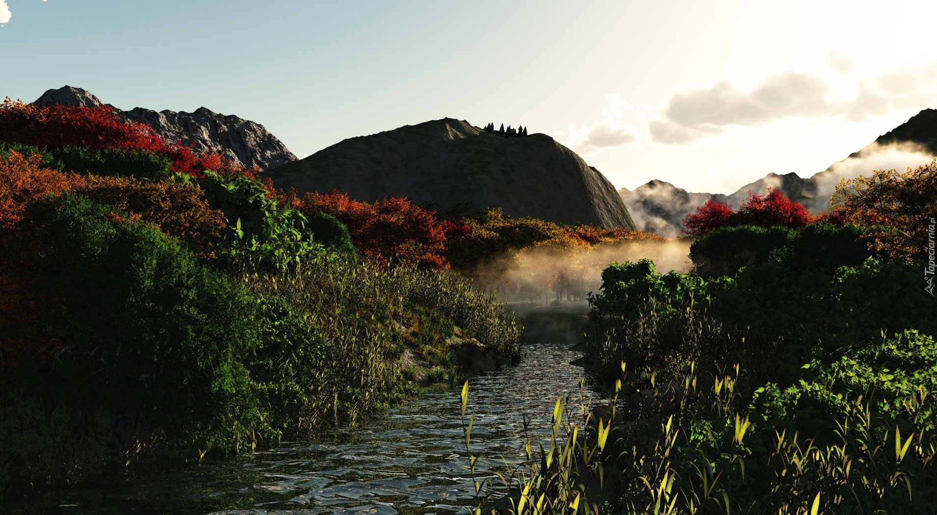 Edytor tapety: Rzeka, Górki, Drzewa, Mgła