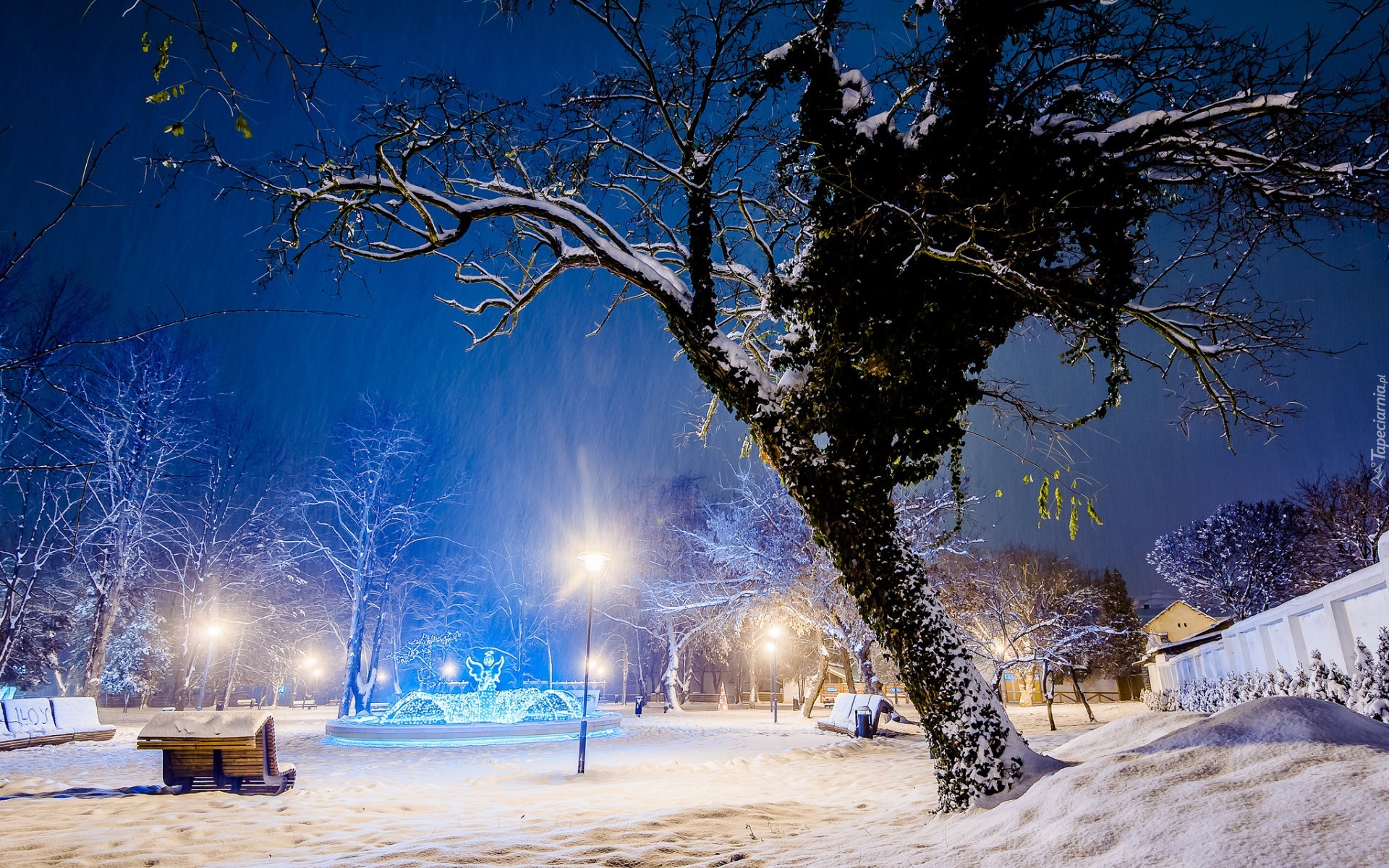 Edytor tapety: Park, Zima, Fontanna, Drzewa, Latarnie