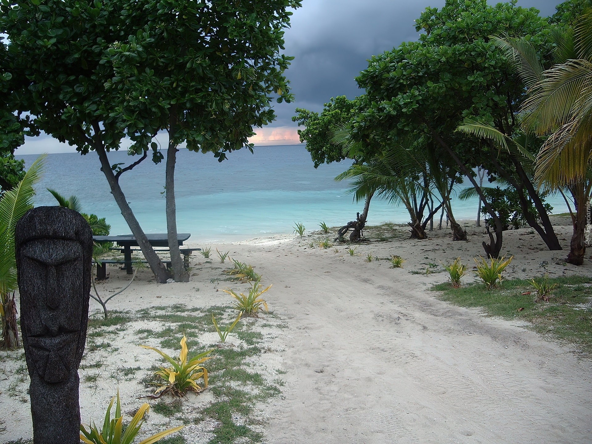 Edytor tapety: Fidżi, Morze, Plaża, Ławeczka, Drzewa