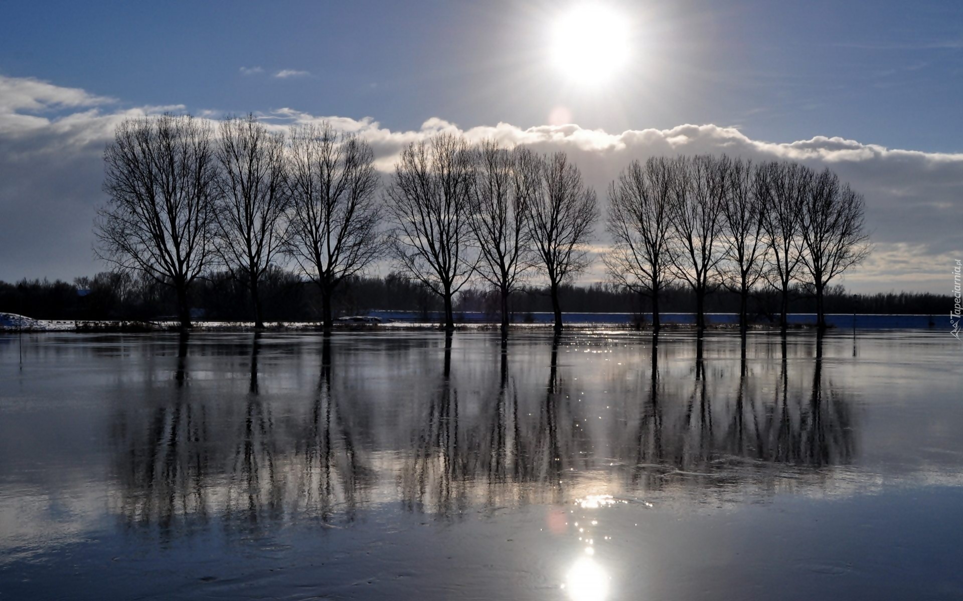 Edytor tapety: Zamarznięte, Jezioro, Drzewa, Słońce, Odbicie
