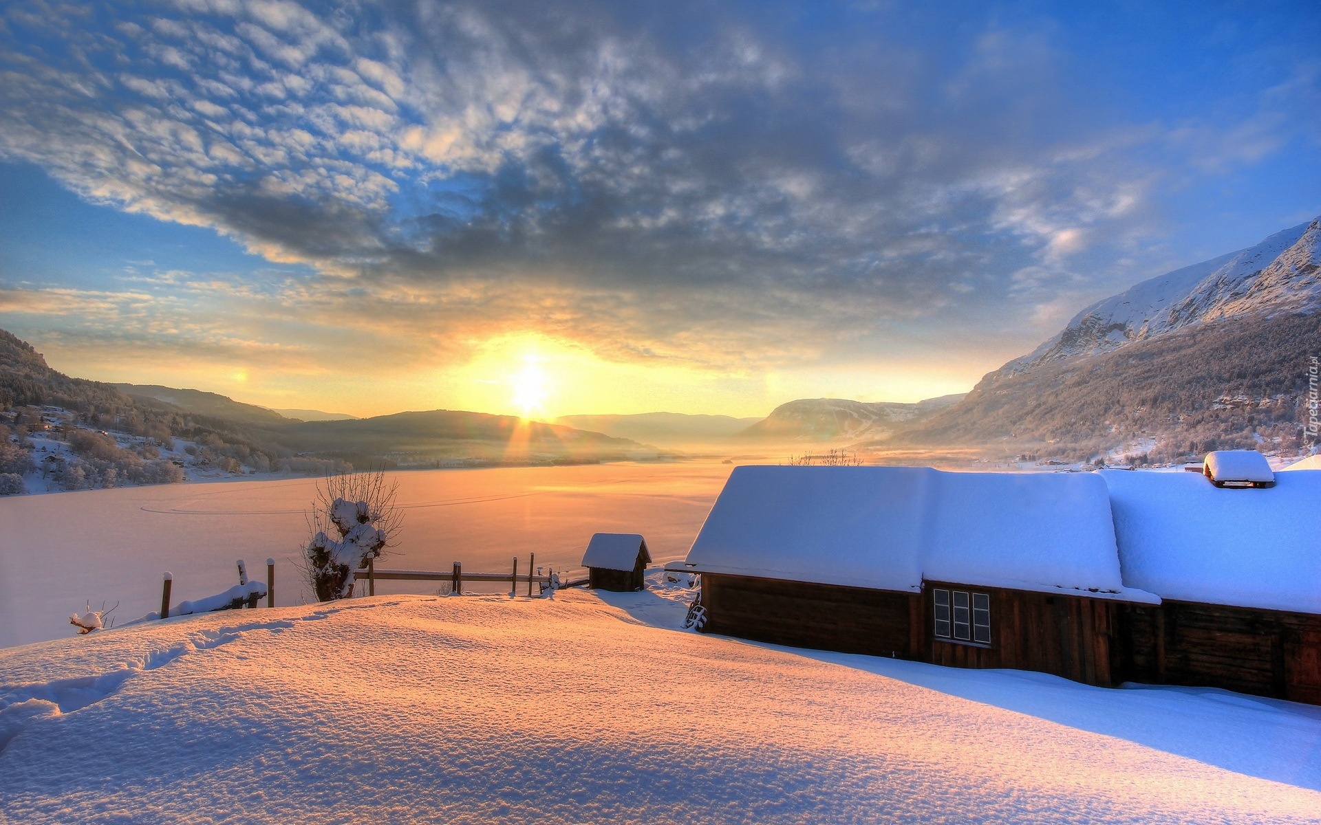 Edytor tapety: Rzeka, Góry, Domy, Zachód, Słońca