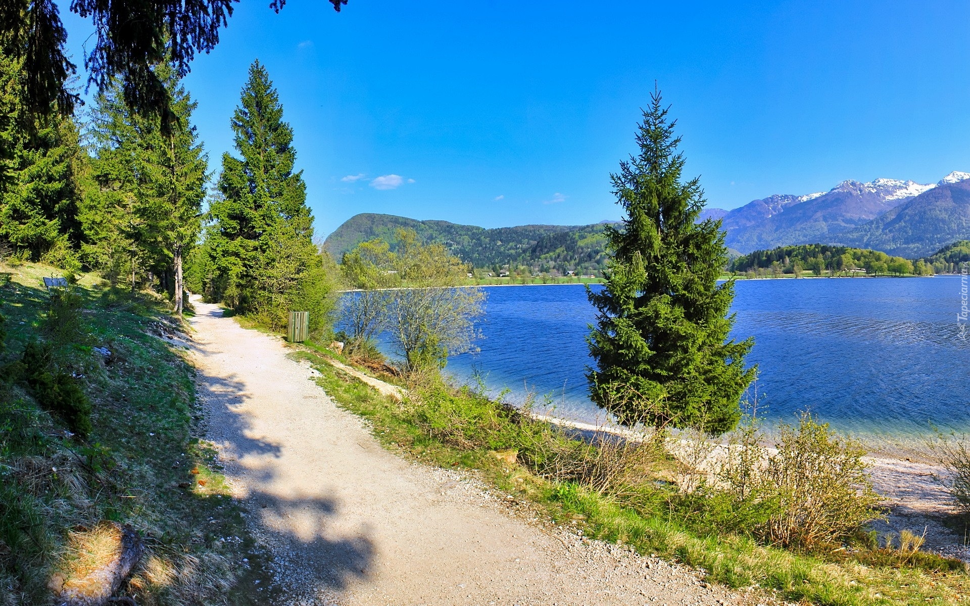 Edytor tapety: Jezioro, Góry, Świerki, Ścieżka, Spacerowa