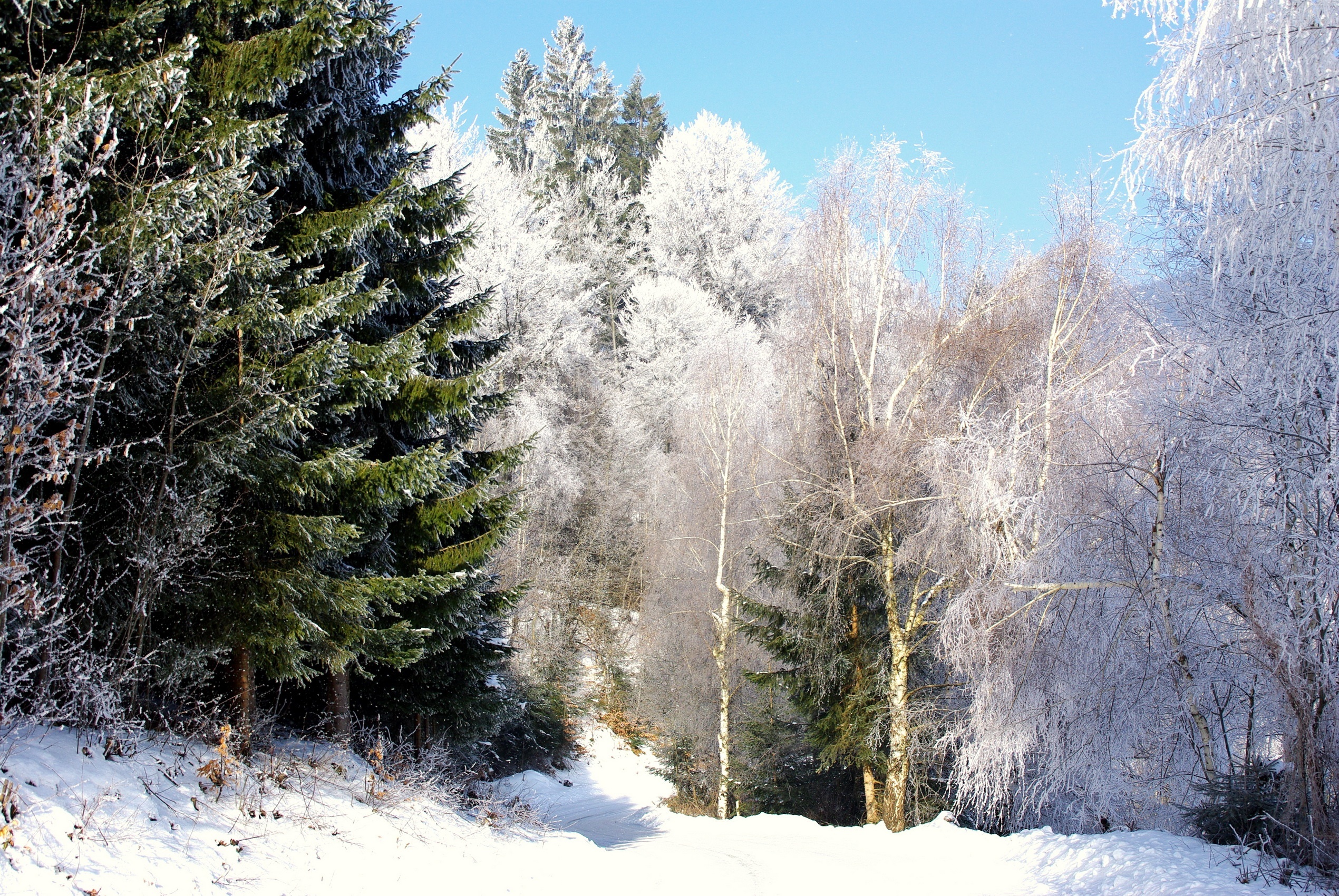 Edytor tapety: Las, Ośnieżone, Drzewa, Droga, Zima