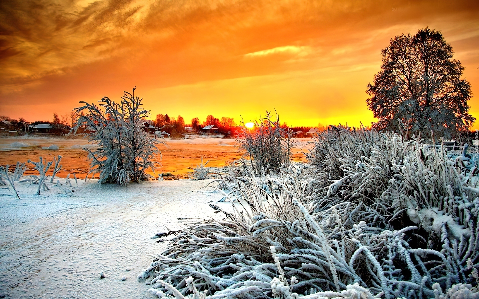 Edytor tapety: Zachód, Słońca, Jezioro, Krzewy, Zima