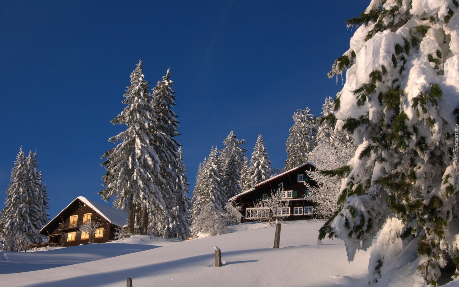 Edytor tapety: Zima, Domy, Ośnieżone, Iglaki, Czyste, Niebo