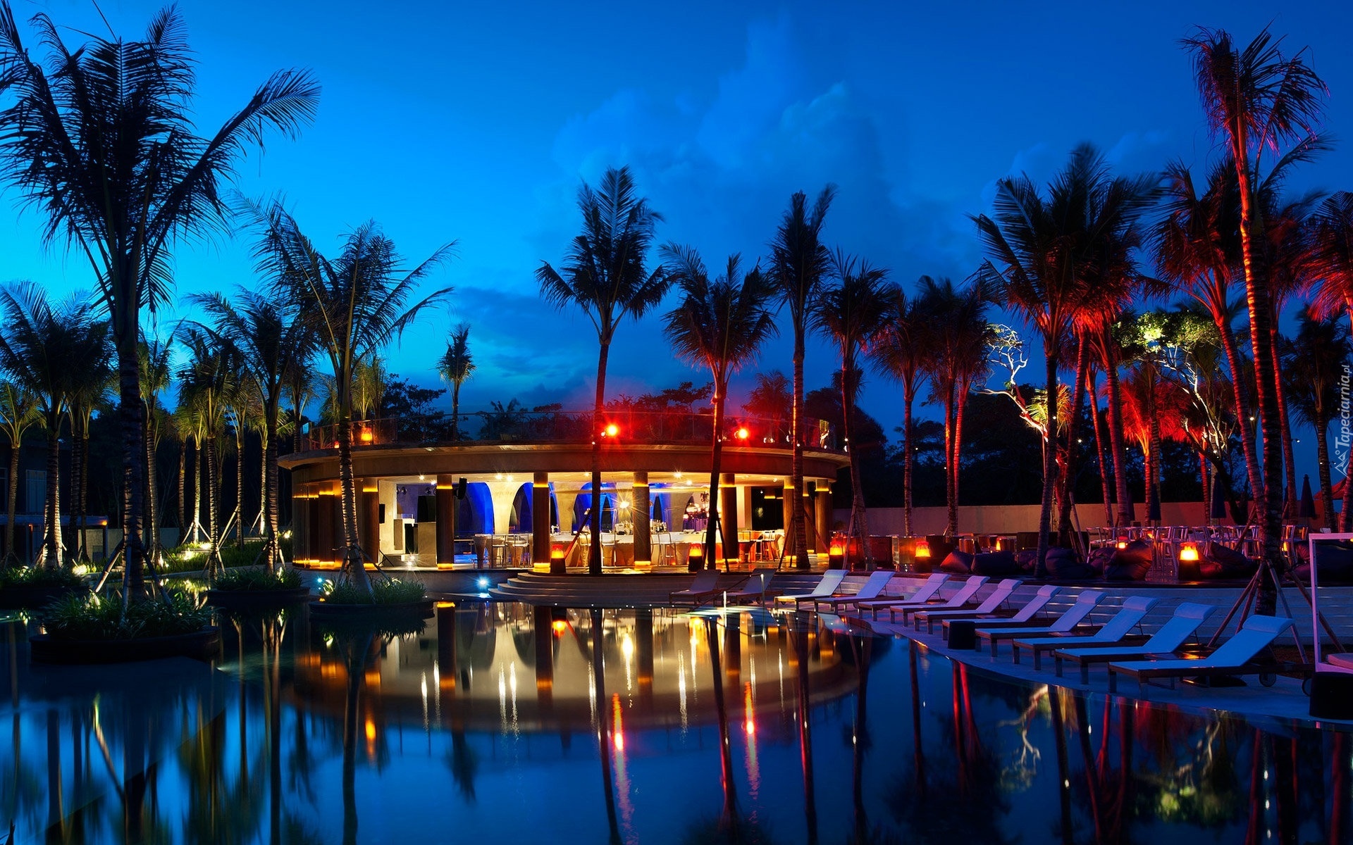 Edytor tapety: Oświetlony, Hotel, Basen, Leżaki, Palmy, Wakacje