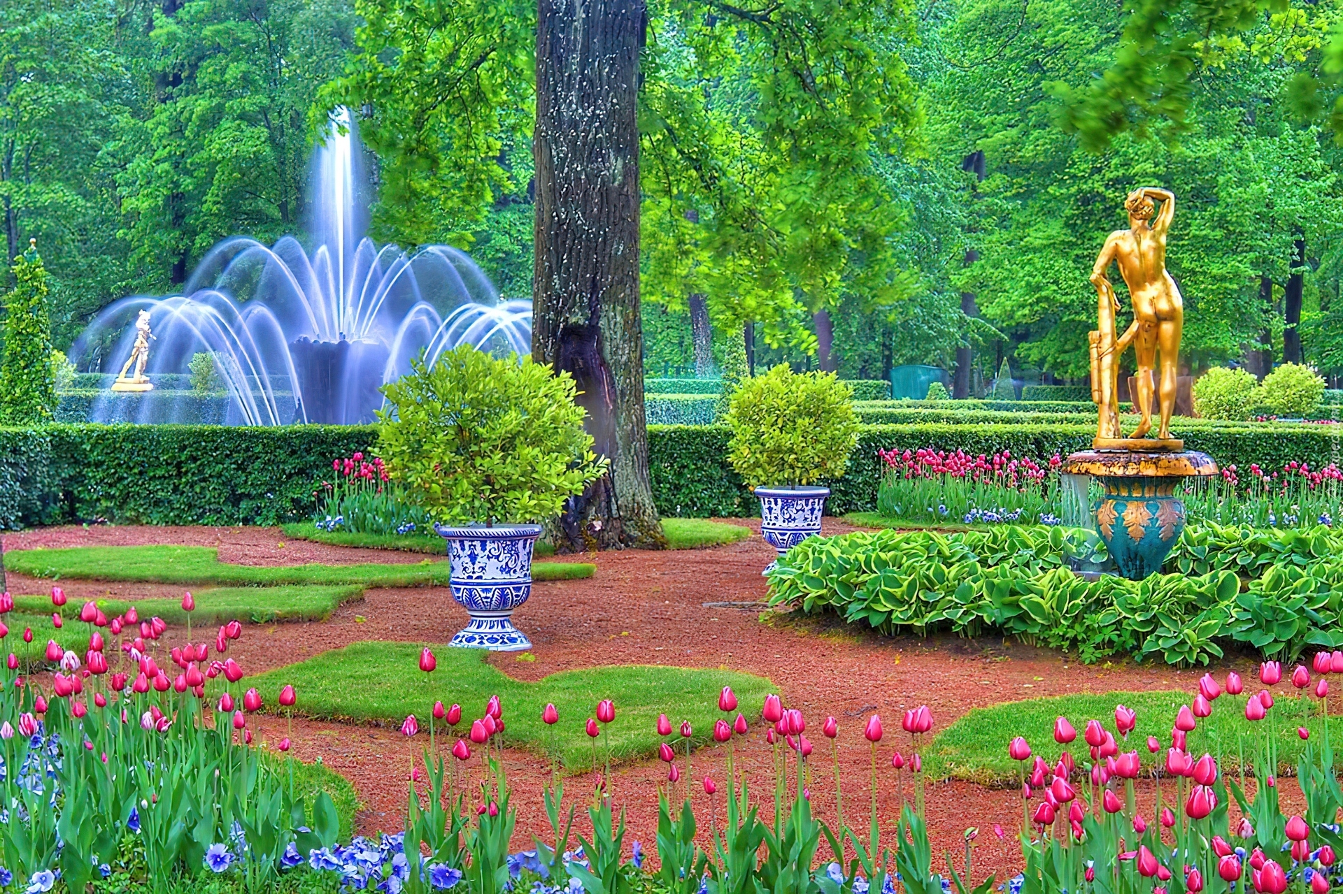 Edytor tapety: Park, Fontanna, Tulipany, Złoty, Posąg