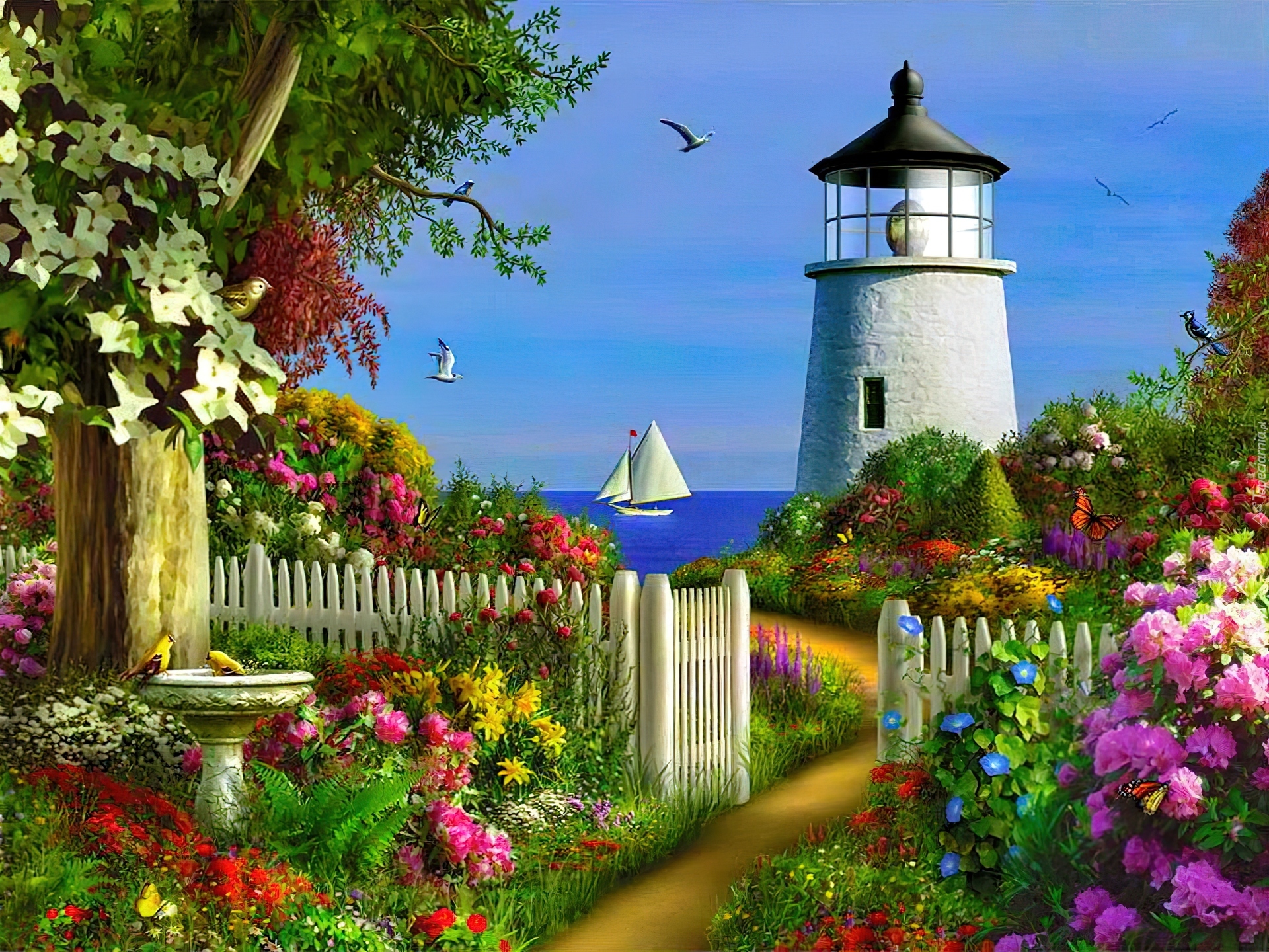 Edytor tapety: Latarnia Morska, Ogród, Morze, Kwiaty
