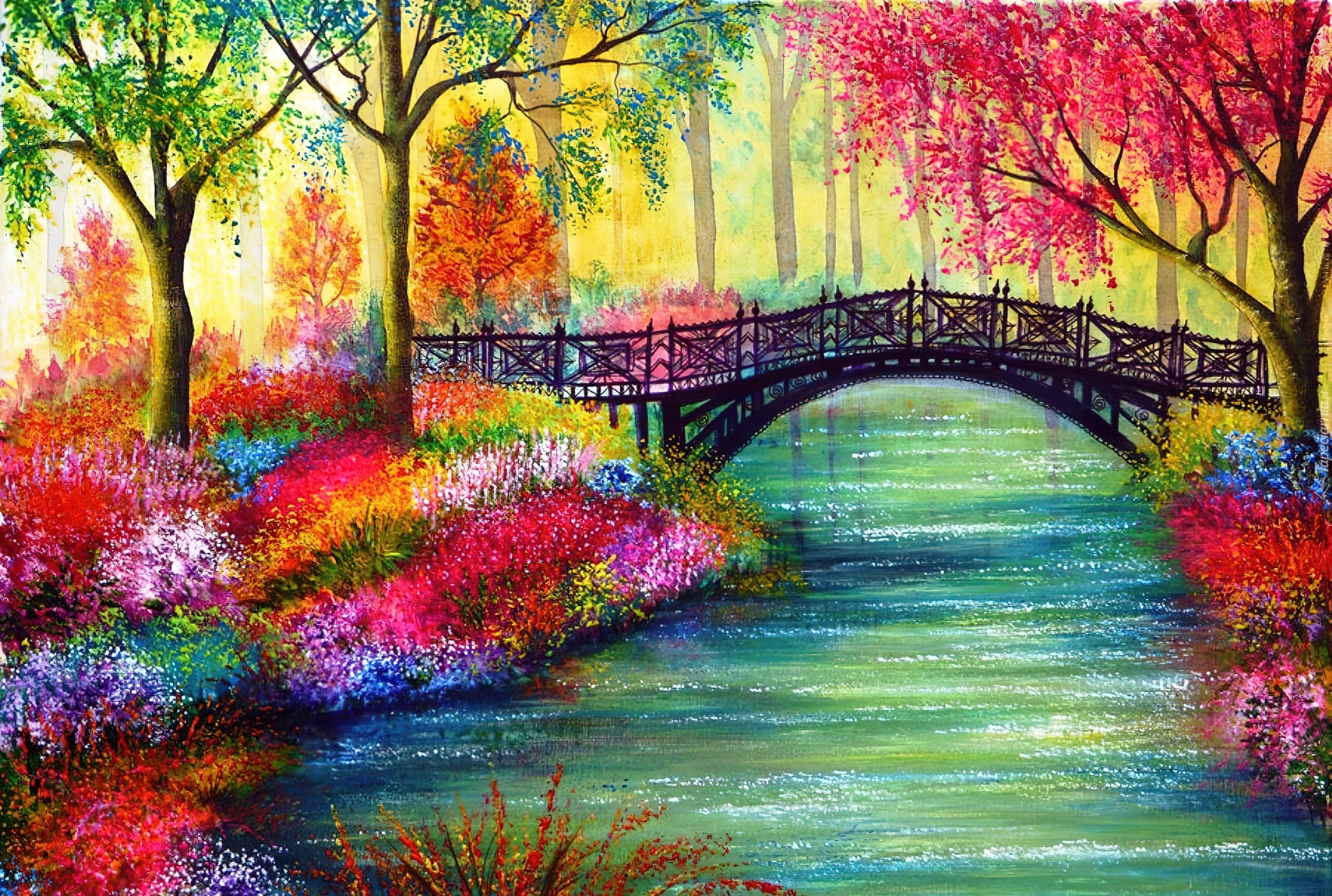 Edytor tapety: Rzeka, Most, Drzewa, Kwiaty