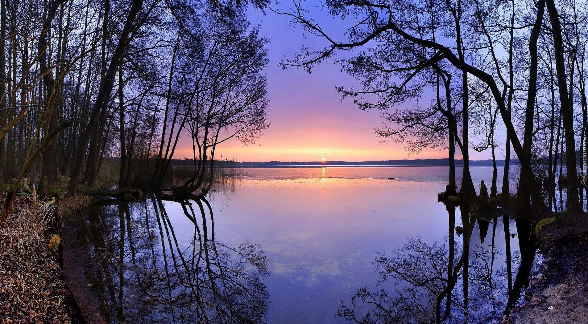 Edytor tapety: Jezioro, Zachód, Słońca, Drzewa