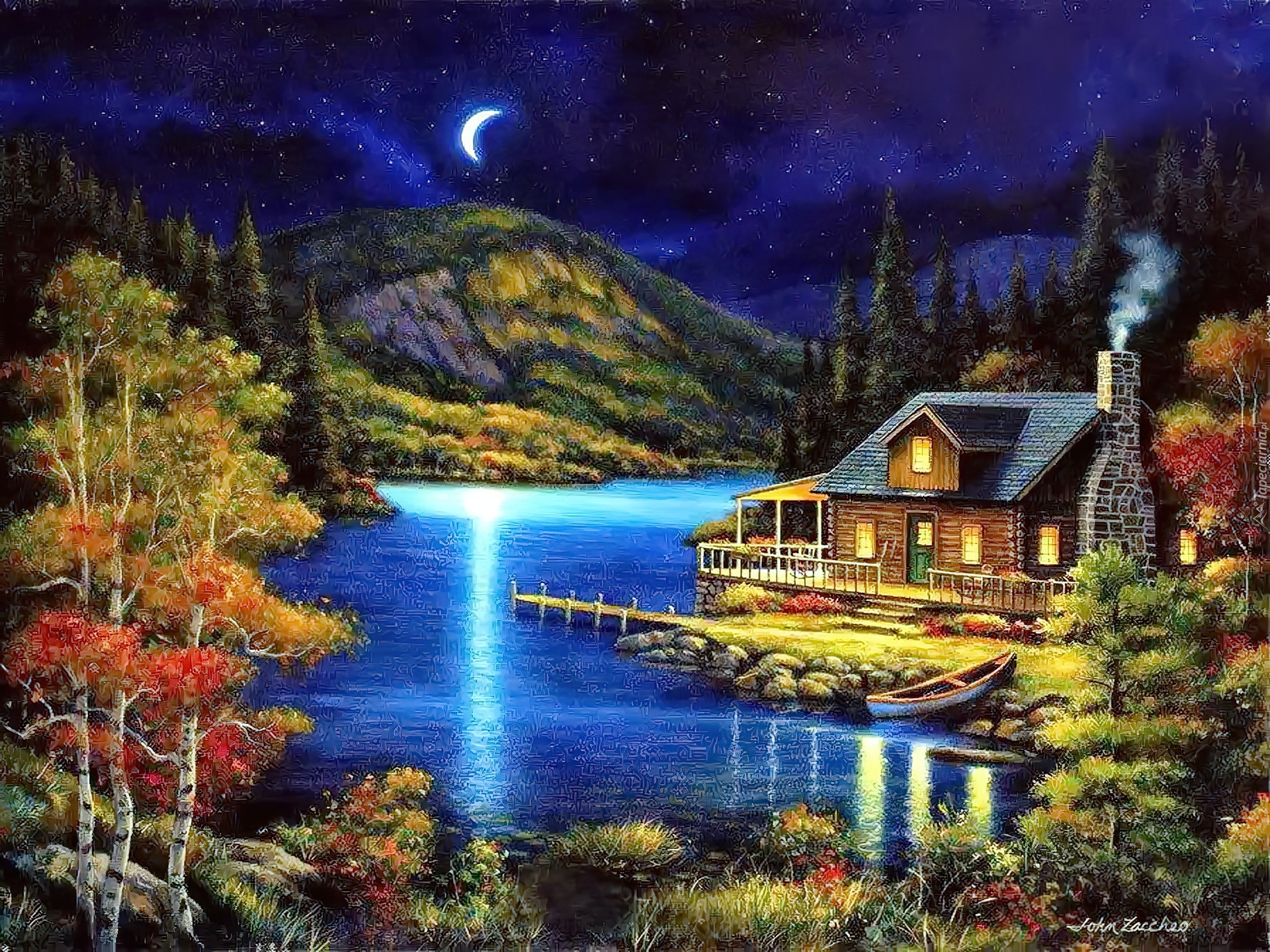 Edytor tapety: Jezioro, Domek, Góry, Noc