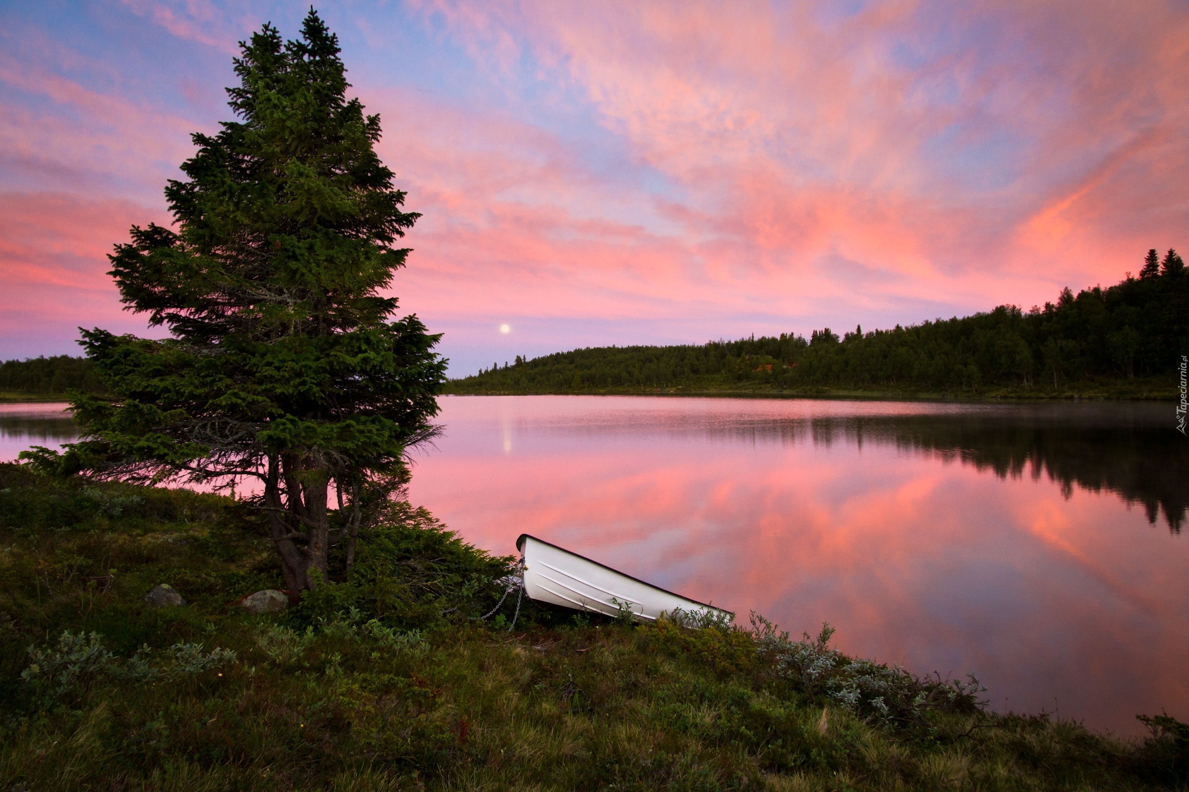 Edytor tapety: Rzeka, Łódz, Lasy, Wschód, Słońca