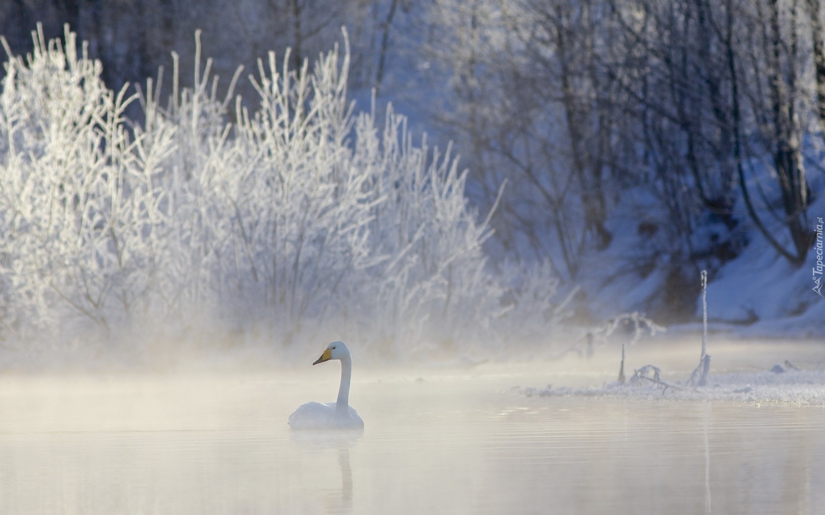 Edytor tapety: Łabędź, Jezioro, Mgła, Las, Zima