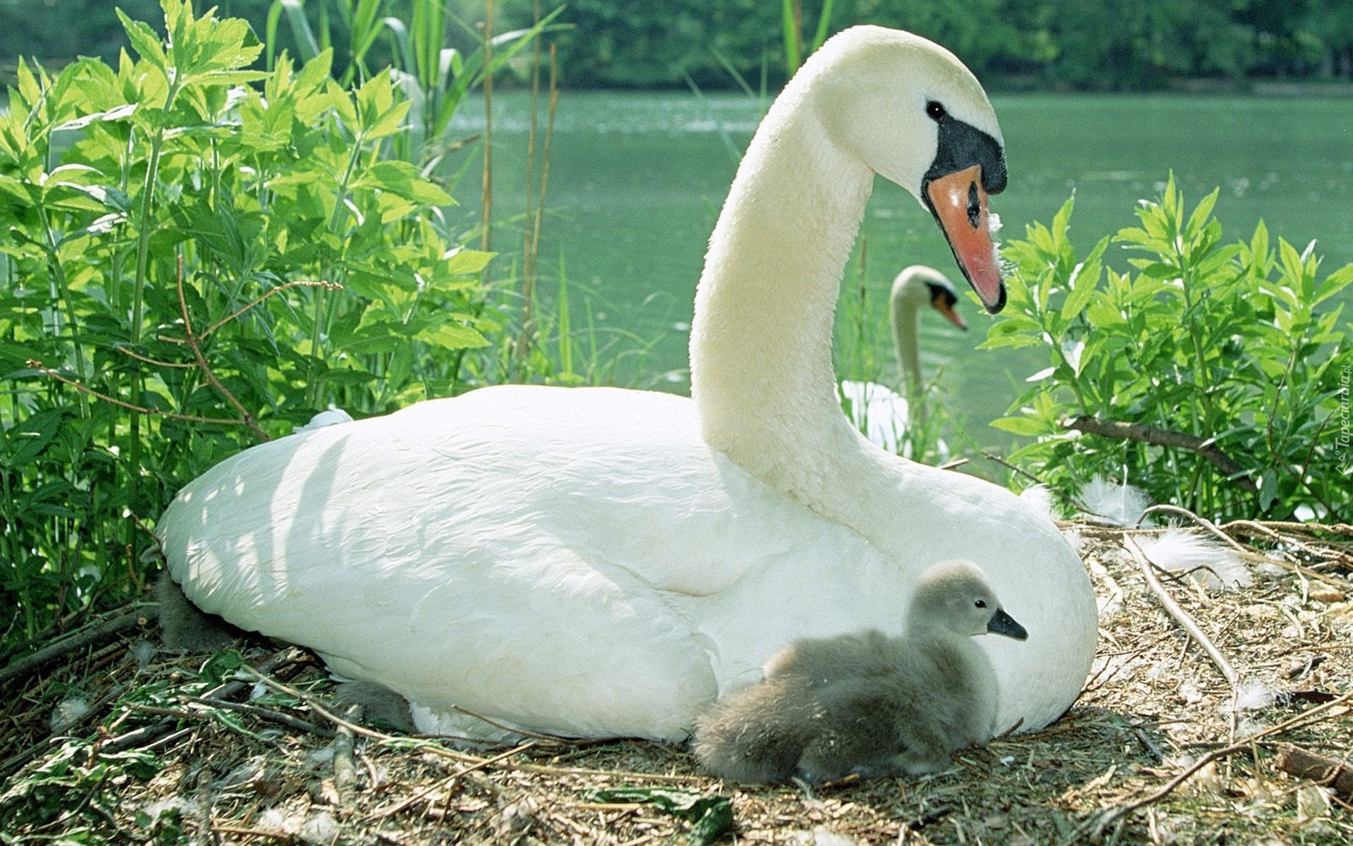 Edytor tapety: Łabędzie, Młode, Jezioro, Rośliny