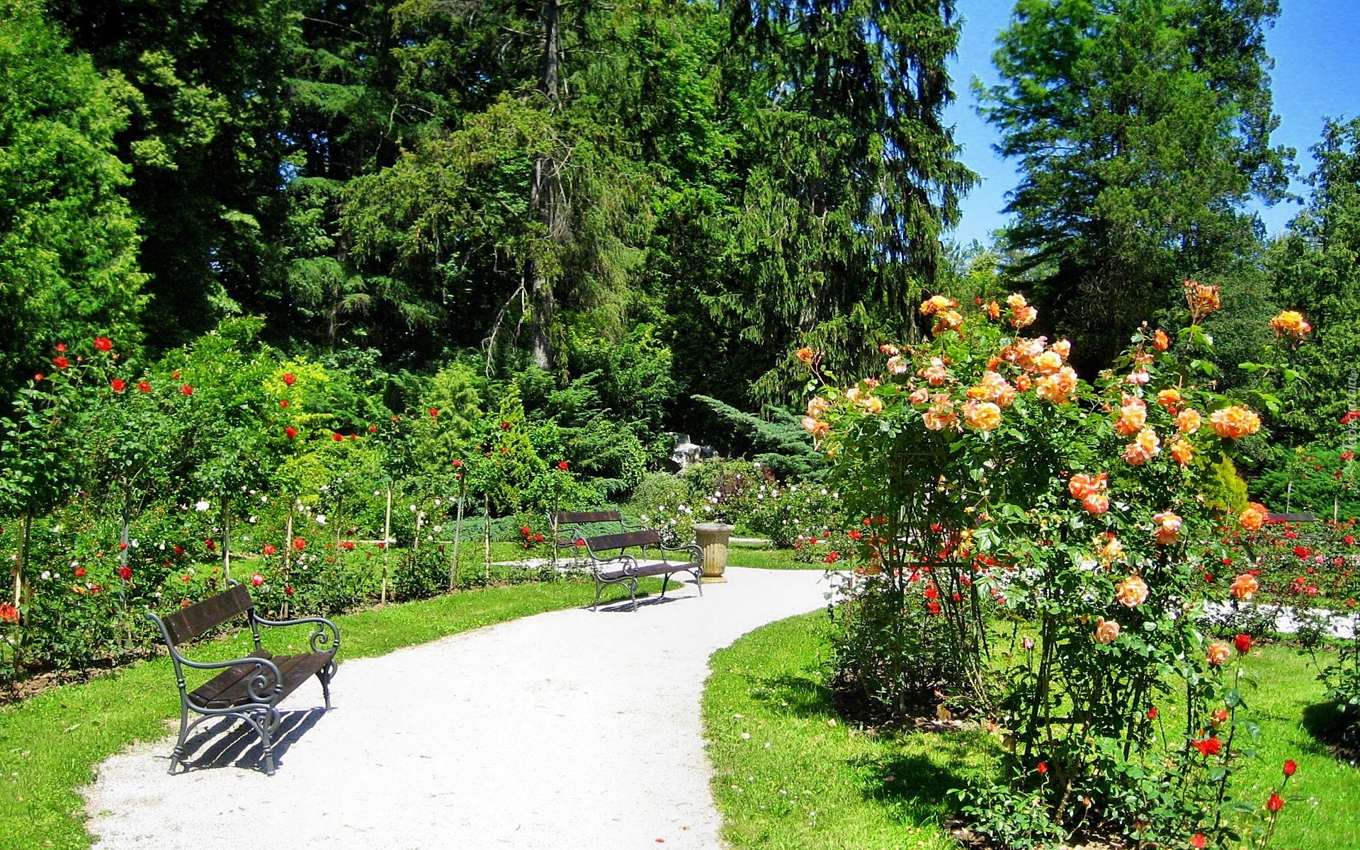 Edytor tapety: Park, Ławeczki, Kwitnące, Róże, Lato
