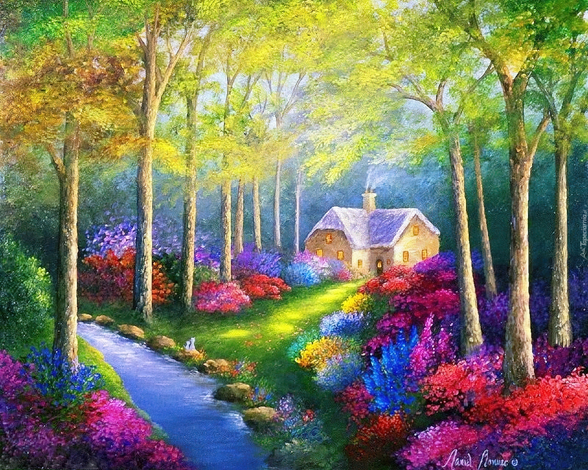 Edytor tapety: Las, Domek, Rzeka, Kwiaty