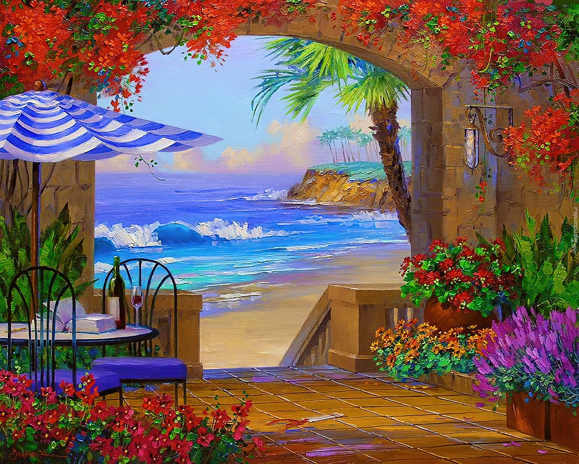 Edytor tapety: Dom, Taras, Kwiaty, Stolik, Parasol