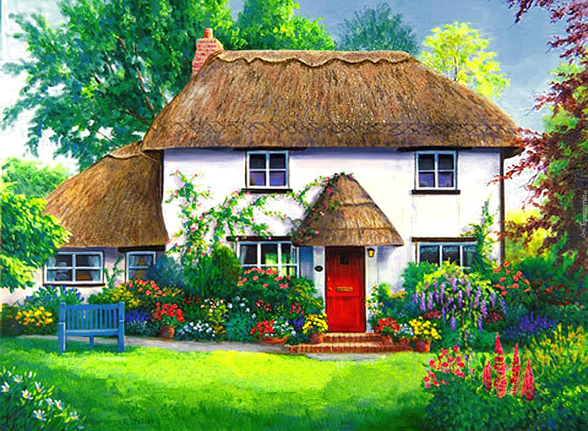 Edytor tapety: Dom, Ogród, Kwiaty, Ławka