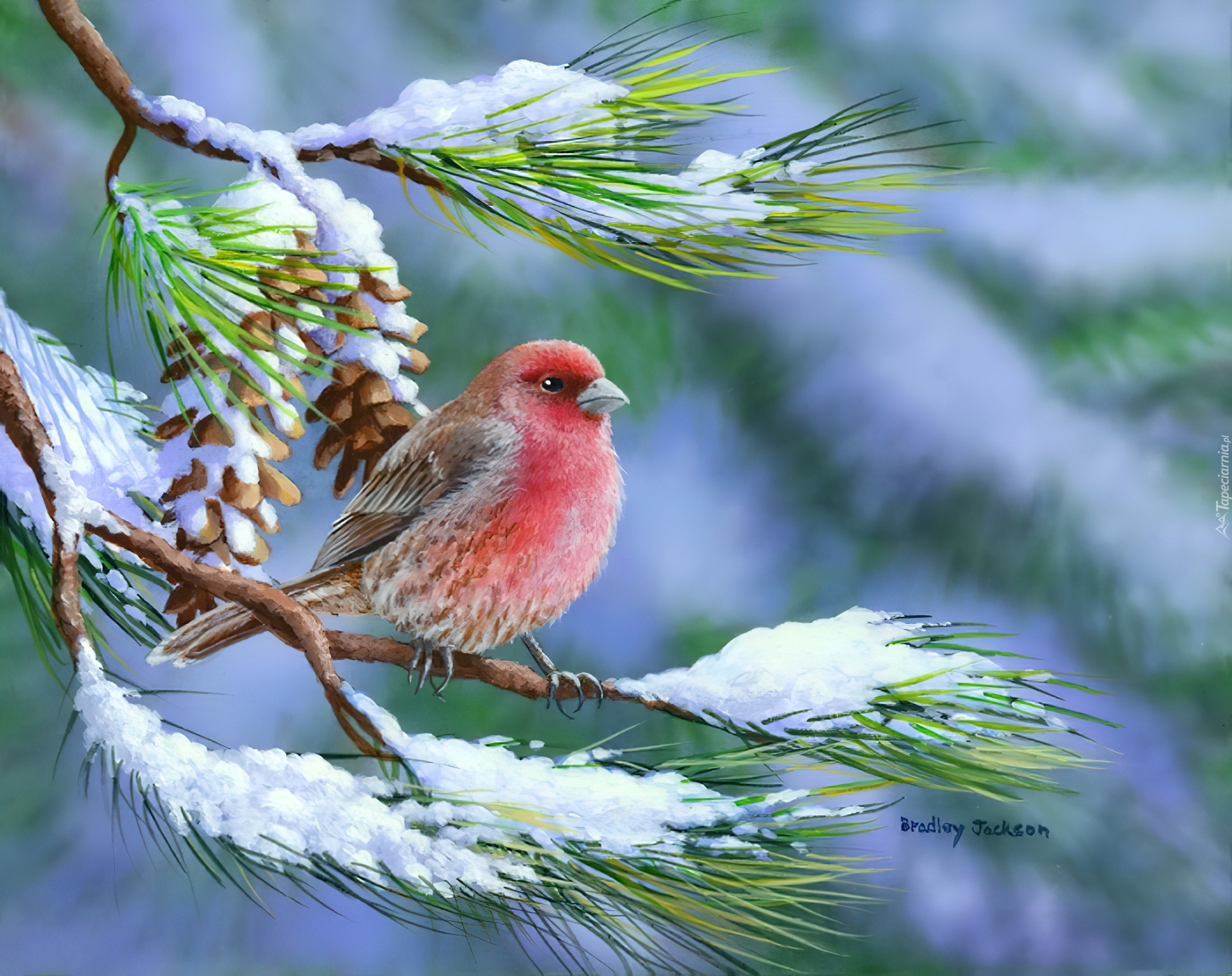 Edytor tapety: Ośnieżona, Gałązka, Iglaka, Ptak