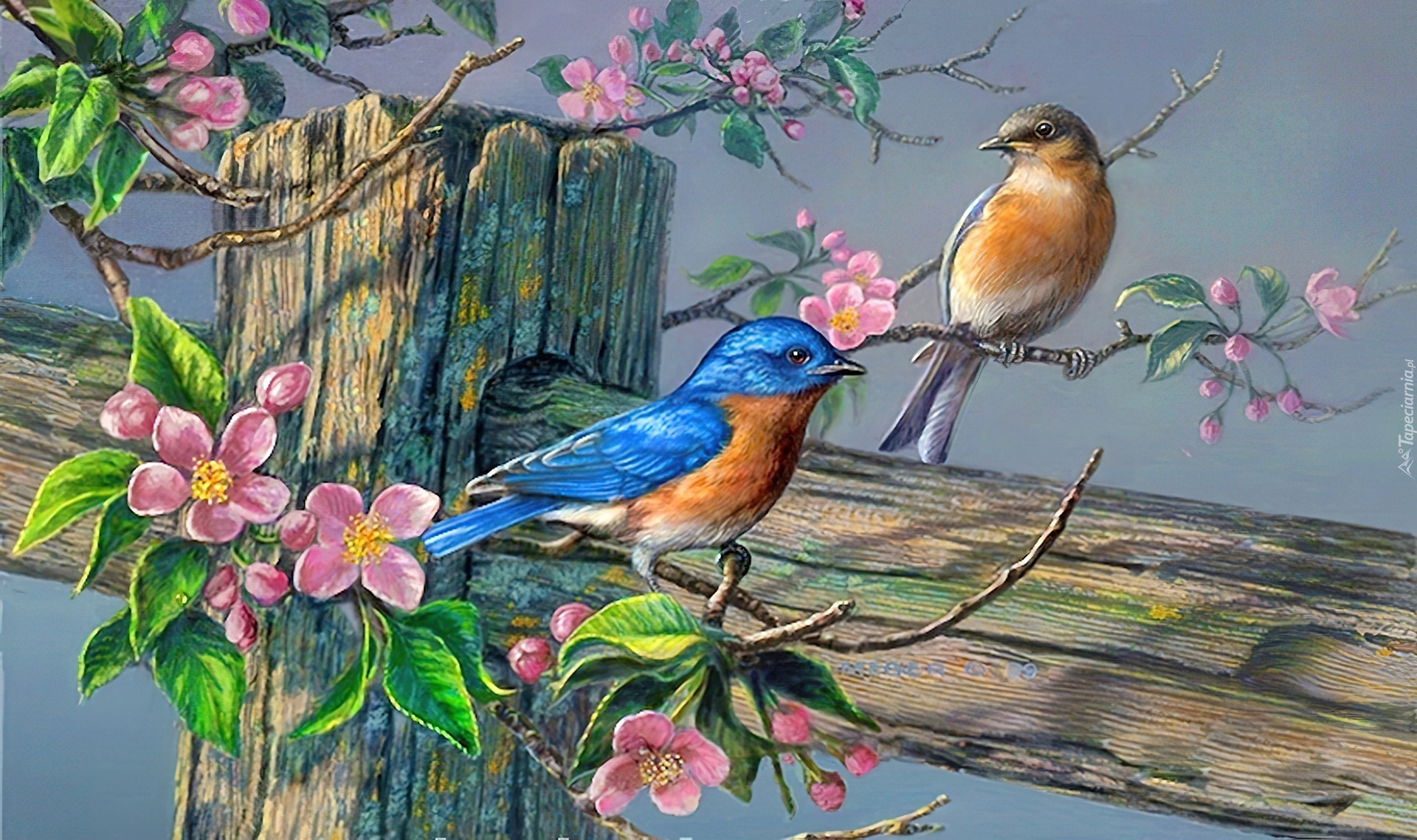 Edytor tapety: Dwa, Rudo, Niebieskie, Ptaki, Płot, Kwiatki