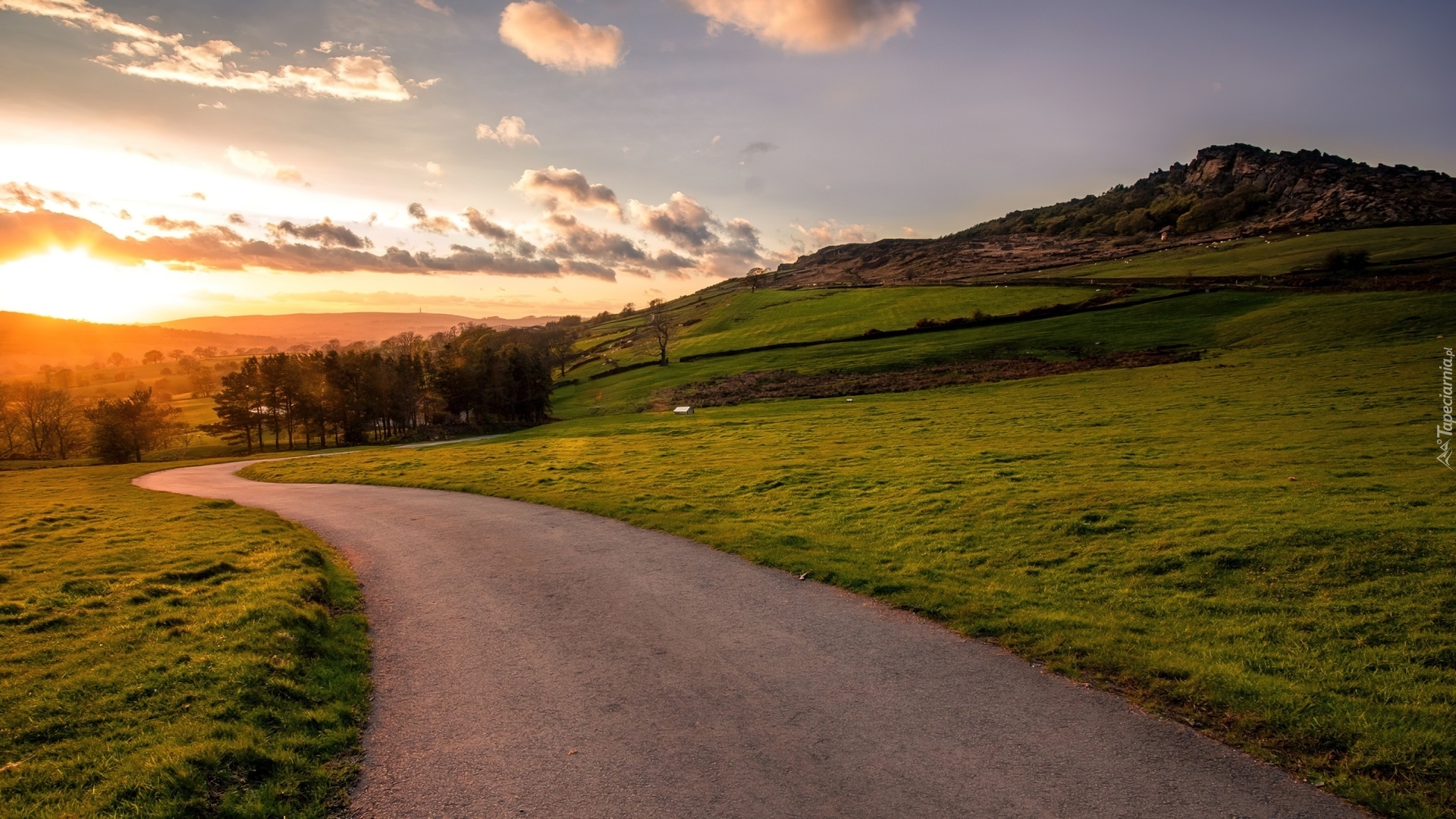 Edytor tapety: Droga, Góry, Zachód Słońca, Łąki