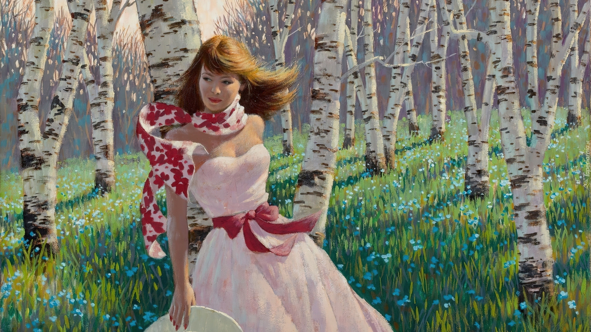 Edytor tapety: Obraz, Brzozy, Kwiaty, Dziewczyna
