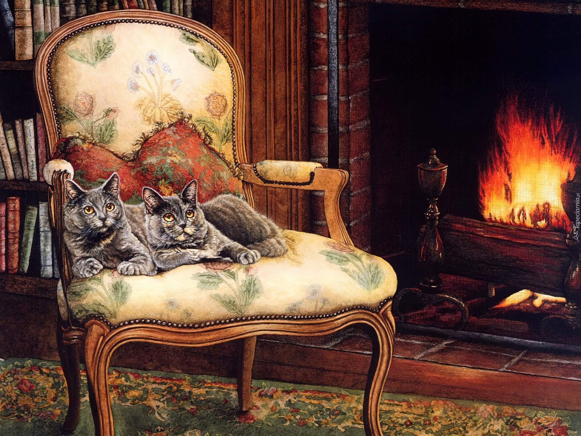 Edytor tapety: Sueellen Ross, Fotel, Koty, Kominek