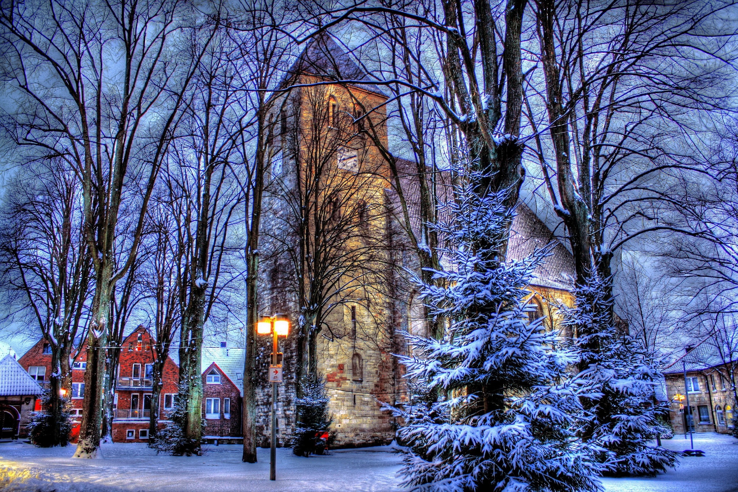 Edytor tapety: Zima, Kościół, Drzewa