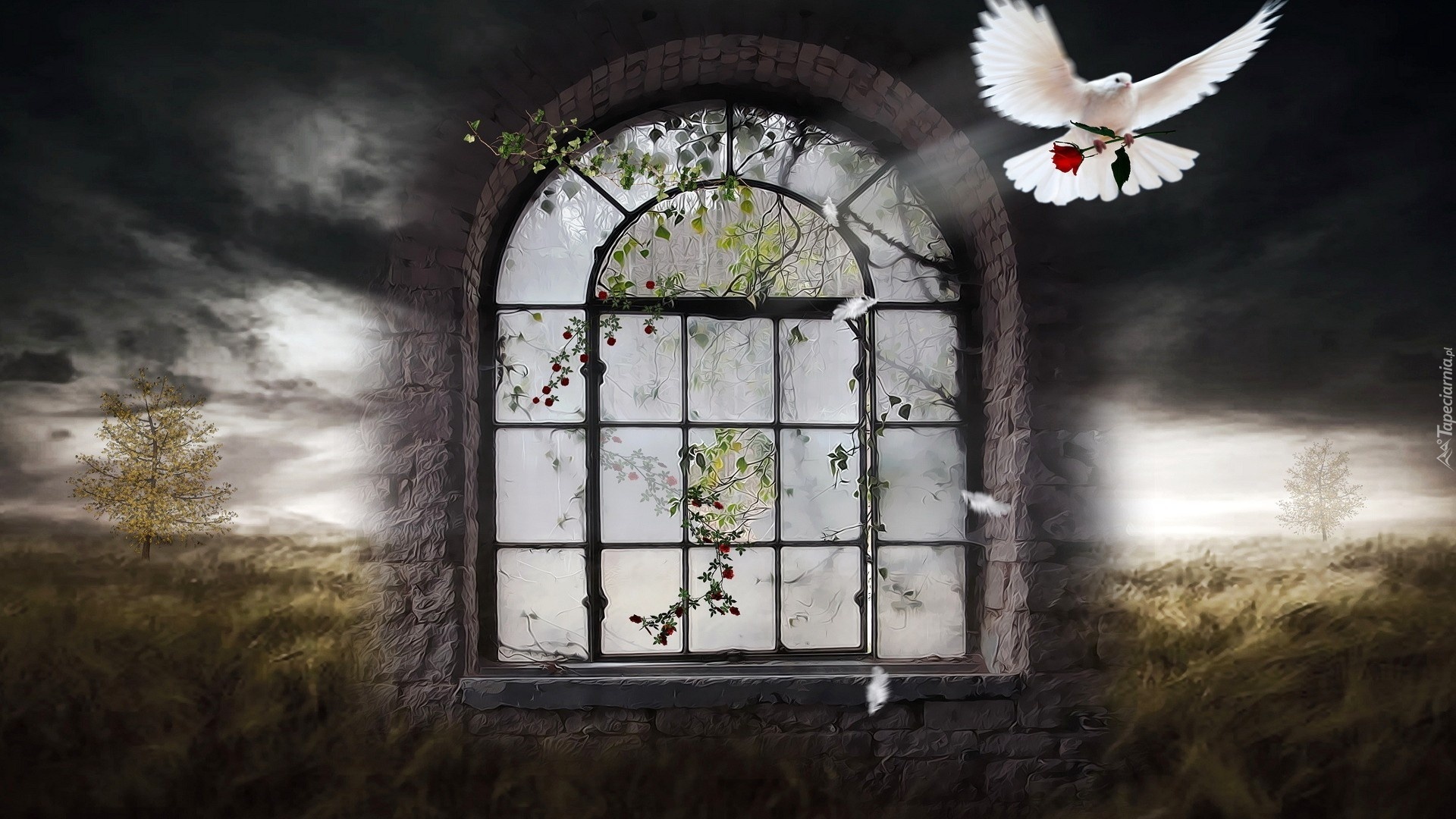Edytor tapety: Gołąb, Okno, Ciemne, Chmury, Fantasy