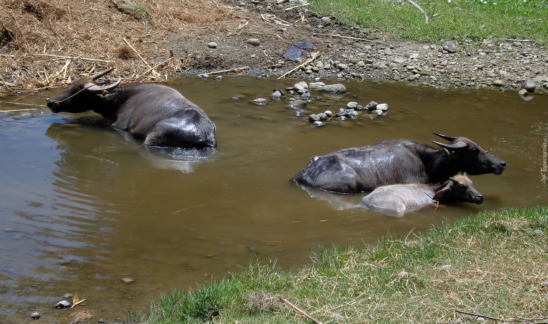 Edytor tapety: Bawoły, Woda, Trawa