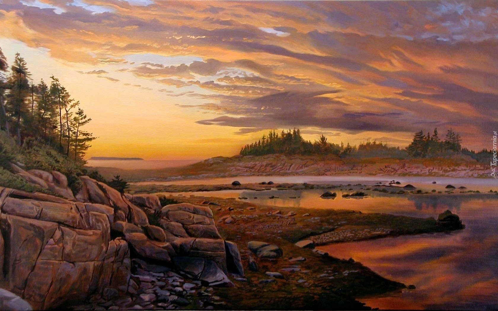 Edytor tapety: Zachód, Słońca, Rzeka, Skały, Drzewa