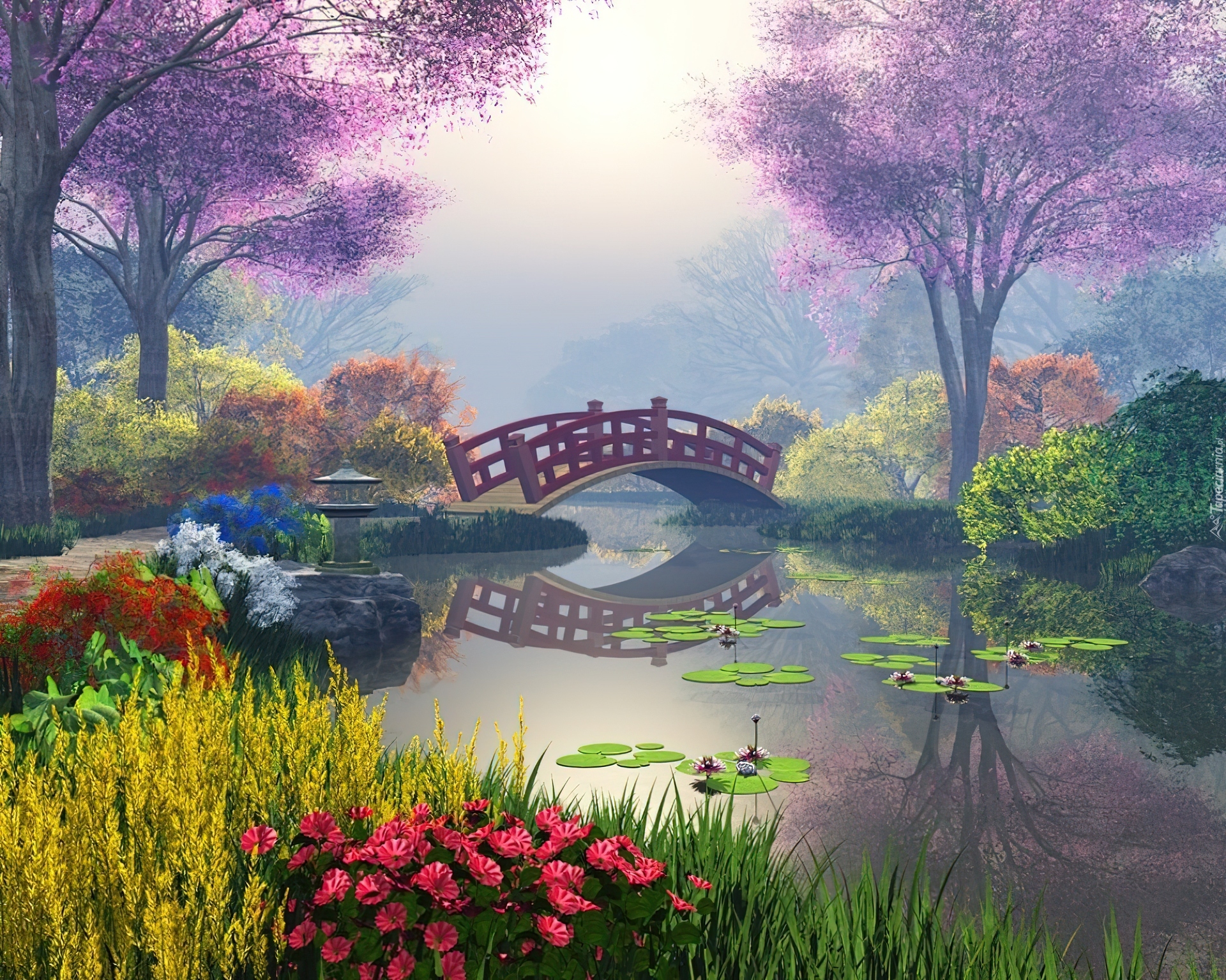 Edytor tapety: Park, Mostek, Rzeka, Kwiaty