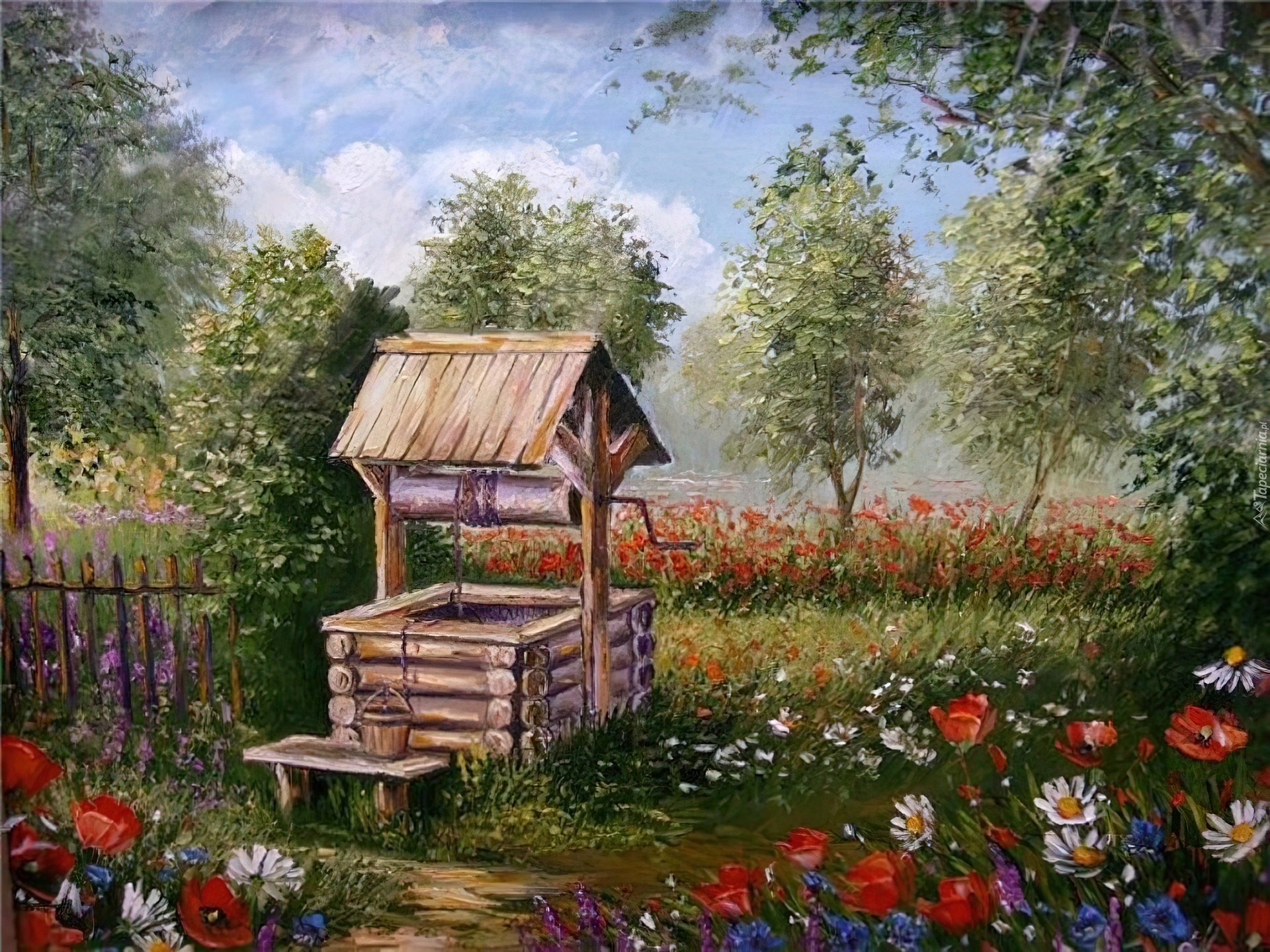 Edytor tapety: Ogród, Studnia, Kwiaty
